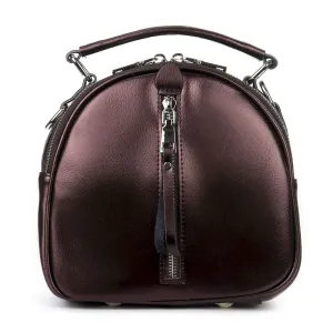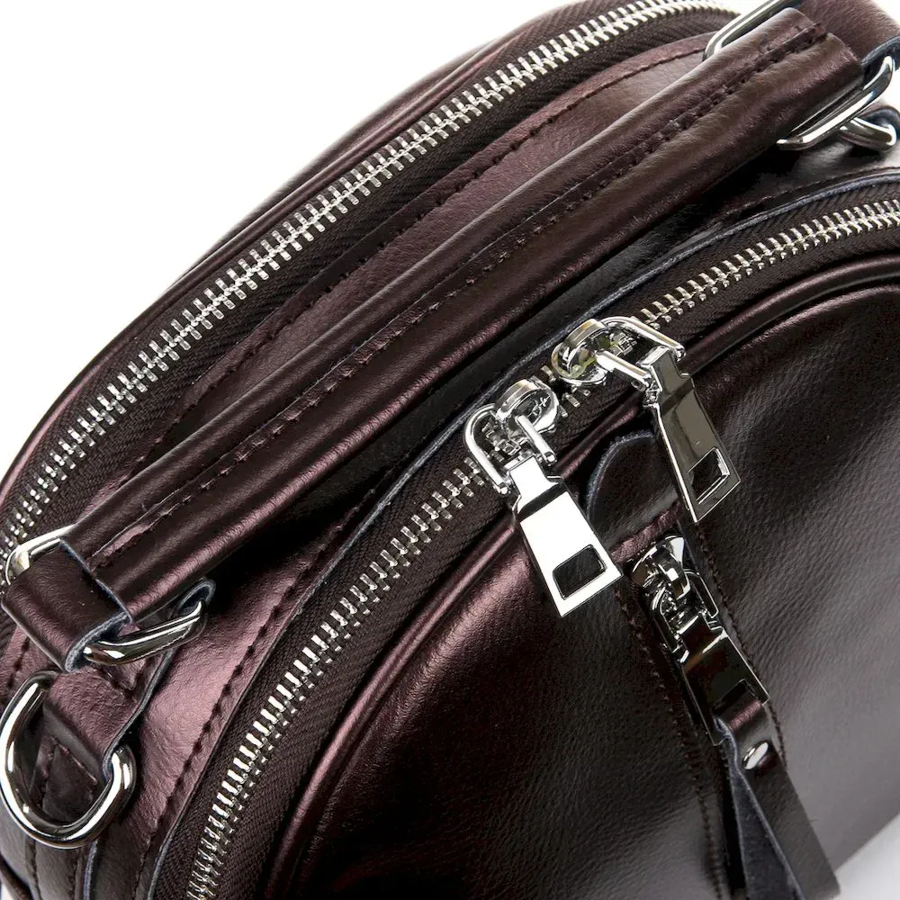 Жіноча шкіряна сумочка-рюкзак. Виготовлена із щільної натуральної шкіри. Можна носити як рюкзак або на плечі на ремені, що регулюється. Два відділення, що закриваються на блискавку. Усередині відділень є подвійна відкрита кишеня та кишеня на блискавці. На фасаді та зворотному боці знаходяться кишені на блискавці. Плечові лямки регулюються за довжиною.