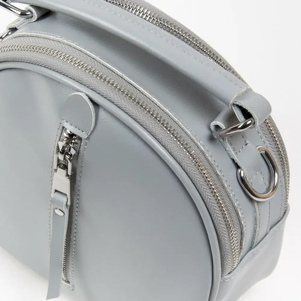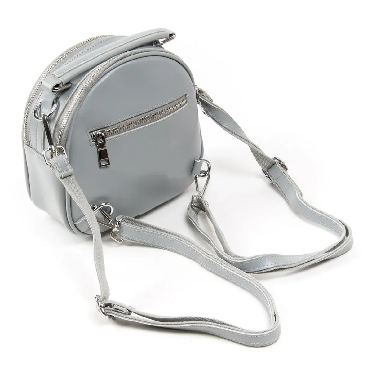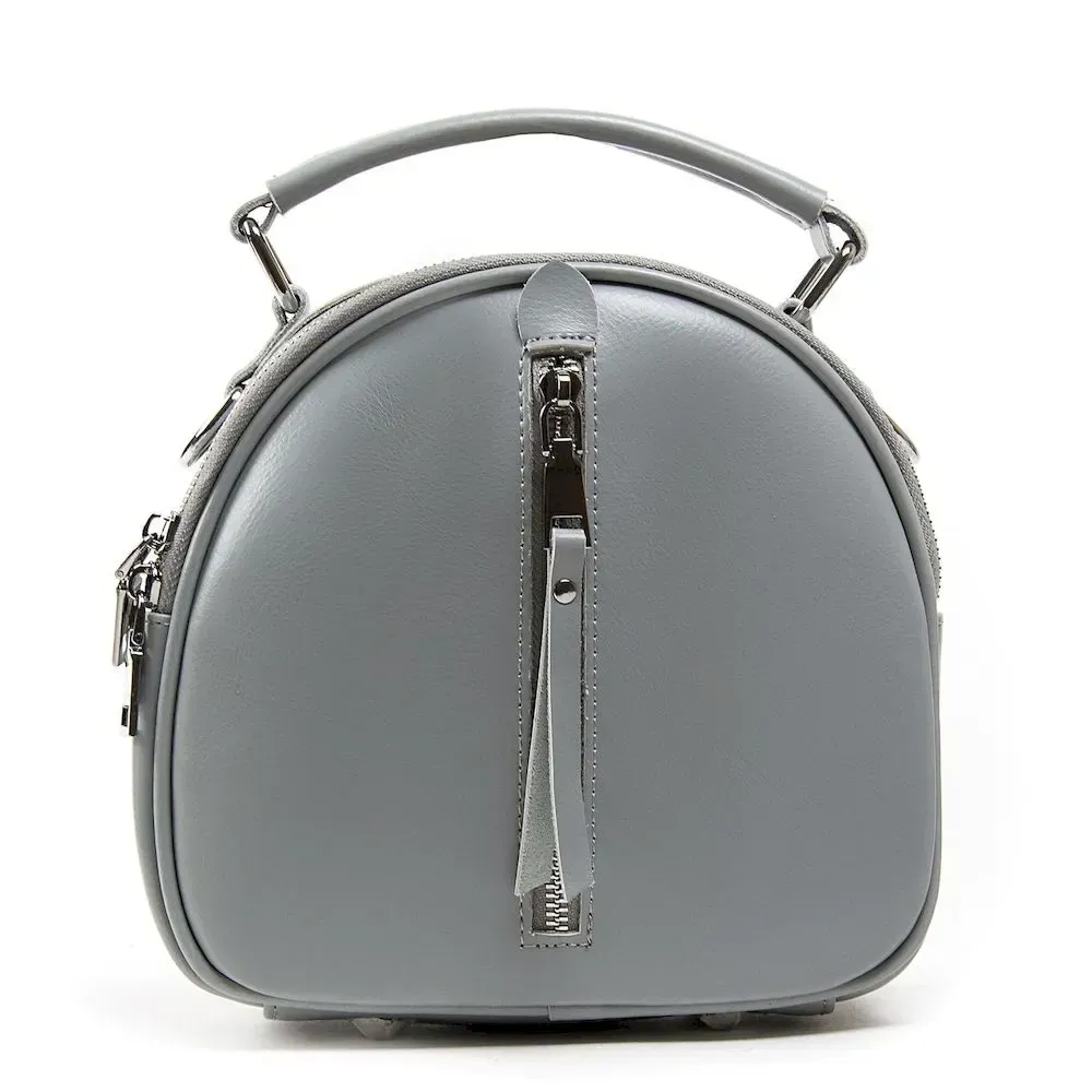 Жіноча шкіряна сумочка-рюкзак. Виготовлена із щільної натуральної шкіри. Можна носити як рюкзак або на плечі на ремені, що регулюється. Два відділення, що закриваються на блискавку. Усередині відділень є подвійна відкрита кишеня та кишеня на блискавці. На фасаді та зворотному боці знаходяться кишені на блискавці. Плечові лямки регулюються за довжиною.