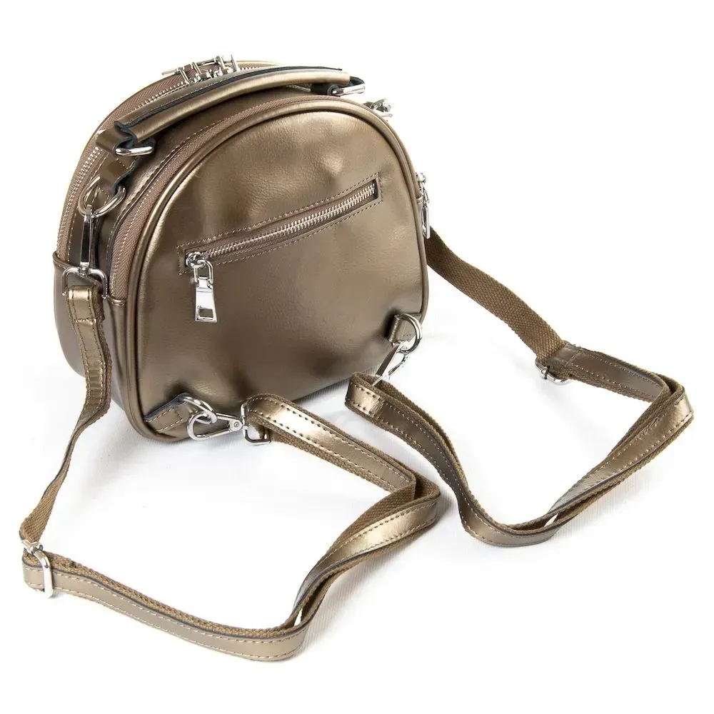 Жіноча шкіряна сумочка-рюкзак. Виготовлена із щільної натуральної шкіри. Можна носити як рюкзак або на плечі на ремені, що регулюється. Два відділення, що закриваються на блискавку. Усередині відділень є подвійна відкрита кишеня та кишеня на блискавці. На фасаді та зворотному боці знаходяться кишені на блискавці. Плечові лямки регулюються за довжиною.