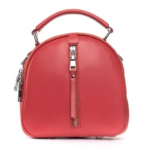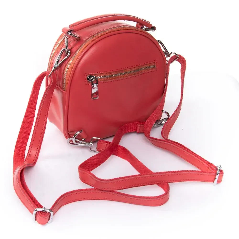 Жіноча шкіряна сумочка-рюкзак. Виготовлена із щільної натуральної шкіри. Можна носити як рюкзак або на плечі на ремені, що регулюється. Два відділення, що закриваються на блискавку. Усередині відділень є подвійна відкрита кишеня та кишеня на блискавці. На фасаді та зворотному боці знаходяться кишені на блискавці. Плечові лямки регулюються за довжиною.