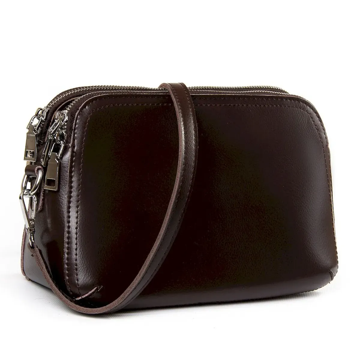 Жіноча сумочка-клатч. Виготовлена із натуральної м'якої шкіри. Три відділення, що закриваються на блискавці. Усередині центрального відділення знаходиться подвійна відкрита кишеня та кишеня на блискавці. На звороті є кишеня на блискавці. У комплекті регульований плечовий ремінь і ручка, що знімається.