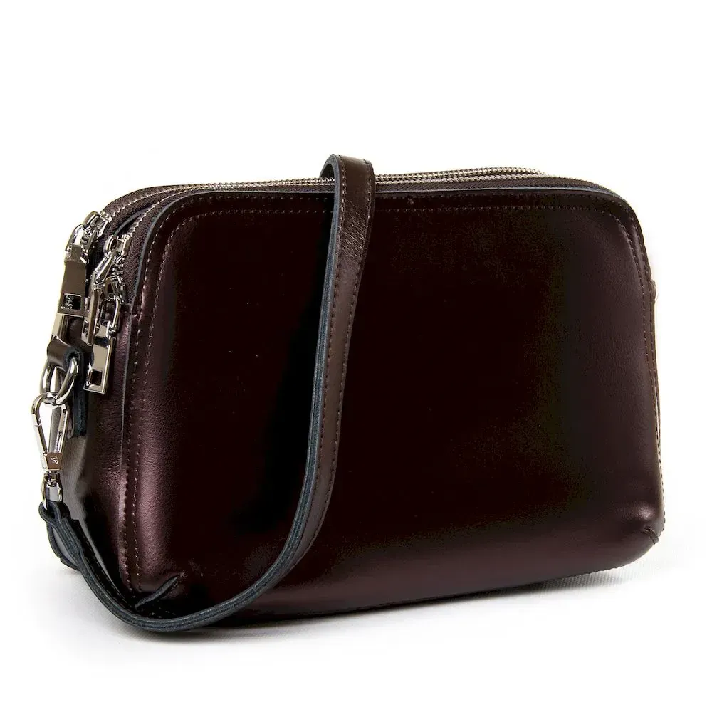 Жіноча сумочка-клатч. Виготовлена із натуральної м'якої шкіри. Три відділення, що закриваються на блискавці. Усередині центрального відділення знаходиться подвійна відкрита кишеня та кишеня на блискавці. На звороті є кишеня на блискавці. У комплекті регульований плечовий ремінь і ручка, що знімається.