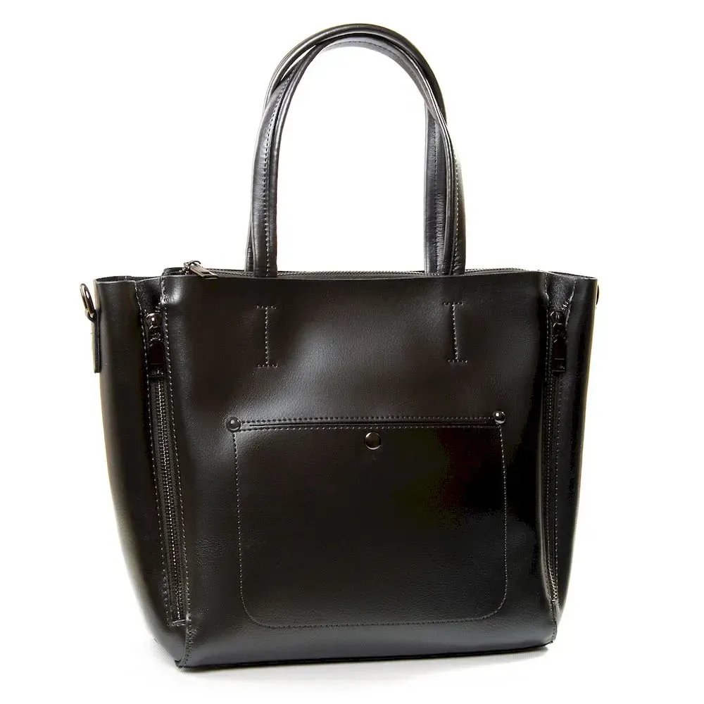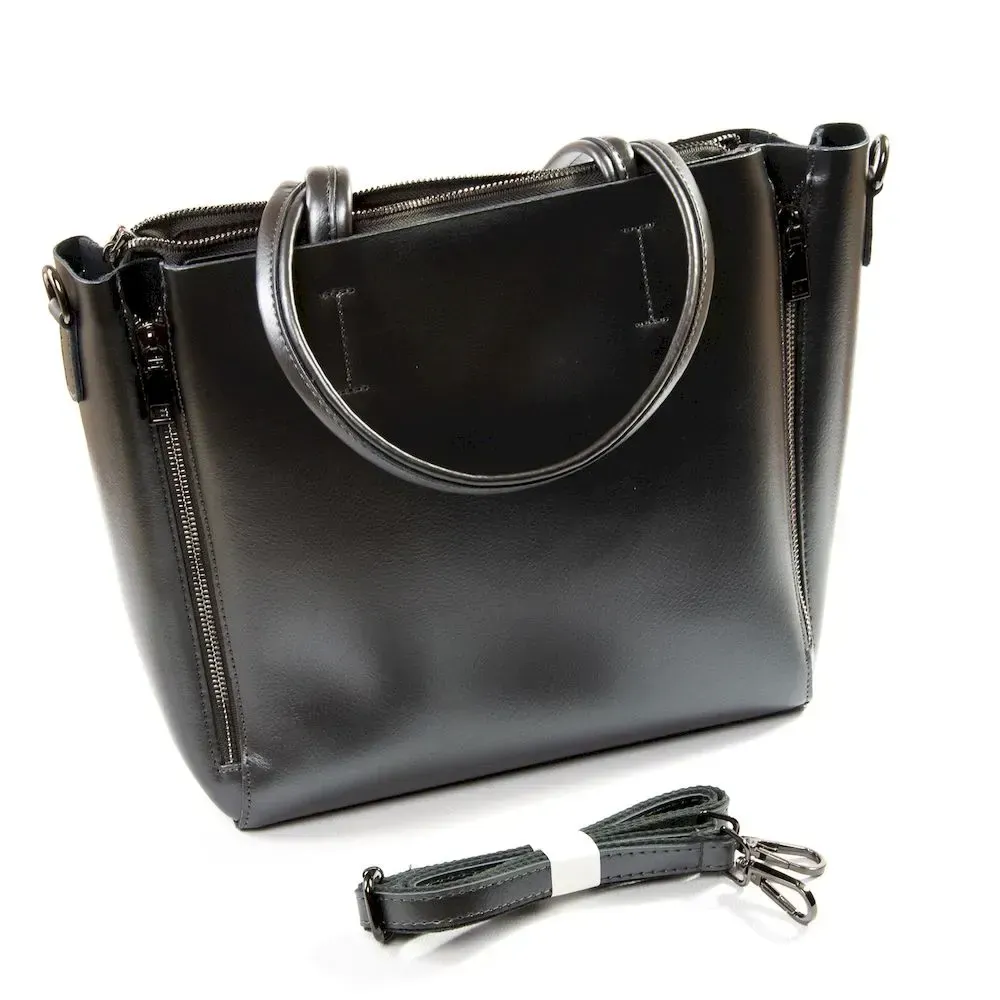 Жіноча сумка. Виготовлена із натуральної щільної шкіри. Закривається на блискавку. Усередині знаходиться подвійне відділення, розділене кишенею-перегородкою на блискавці, подвійна відкрита кишеня та кишеня на блискавці. Зовні сумки на лицьовій стороні знаходиться кишеня на магнітній кнопці. У комплекті регульований плечовий ремінь.