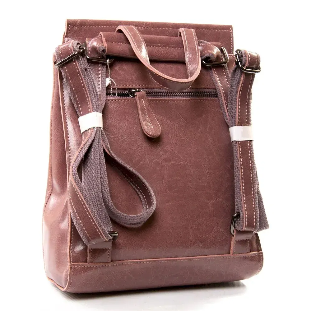 Жіночий шкіряний рюкзак. Виготовлений із натуральної щільної шкіри. Можна носити на плечі на ремені, що регулюється. Під клапаном додатково закривається на блискавку. Усередині знаходиться основне та додаткове відділення, розділене кишенею-перегородкою на блискавці, відкрита кишеня і кишеня на блискавці. Зовні рюкзака на звороті розташована кишеня на блискавці. Плямові лямки регулюються по довжині.