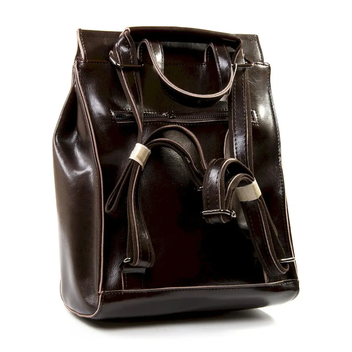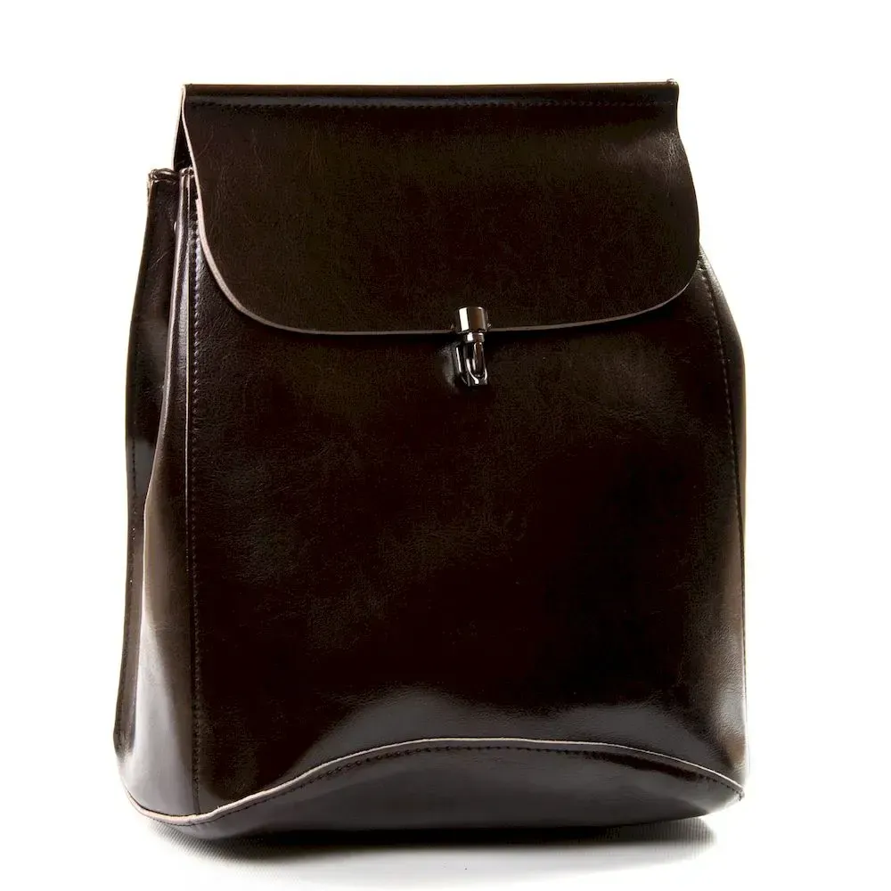 Жіночий шкіряний рюкзак. Виготовлений із натуральної щільної шкіри. Можна носити на плечі на ремені, що регулюється. Під клапаном додатково закривається на блискавку. Усередині знаходиться основне та додаткове відділення, розділене кишенею-перегородкою на блискавці, відкрита кишеня і кишеня на блискавці. Зовні рюкзака на звороті розташована кишеня на блискавці. Плямові лямки регулюються по довжині.