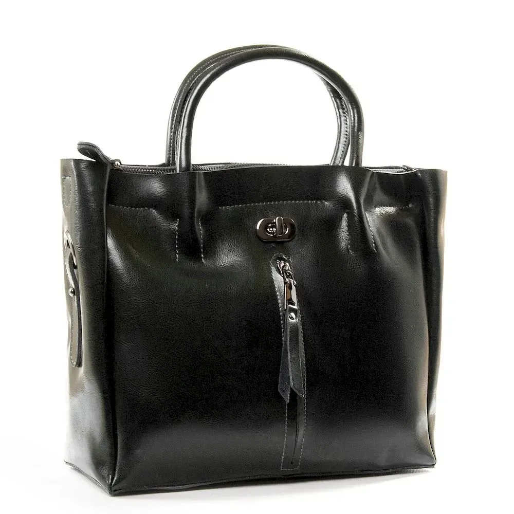 Жіноча сумка. Виготовлена із натуральної шкіри. Закривається на блискавку. Усередині знаходиться подвійне відділення, розділене кишенею-перегородкою на блискавці, подвійна відкрита кишеня та кишеня на блискавці на внутрішніх стінках сумки. На зворотному та лицьовому боці є кишені на блискавці. Сумка має тверде дно. У комплекті регульований плечовий ремінь.