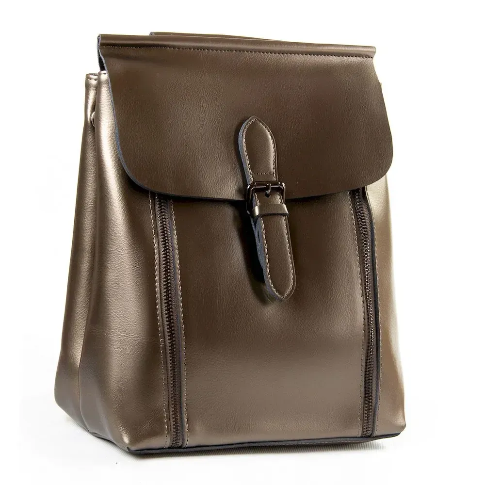 Жіночий шкіряний рюкзак. Виготовлений з натуральної щільної шкіри. Можна носити на плечі на ремені, що регулюється. Під клапаном додатково закривається на блискавку. Усередині знаходиться основне та додаткове відділення, розділене кишенею-перегородкою на блискавці, подвійна відкрита кишеня та кишеня на блискавці. Зовні рюкзака на звороті розташована кишеня на блискавці. Плямові лямки регулюються за довжиною.