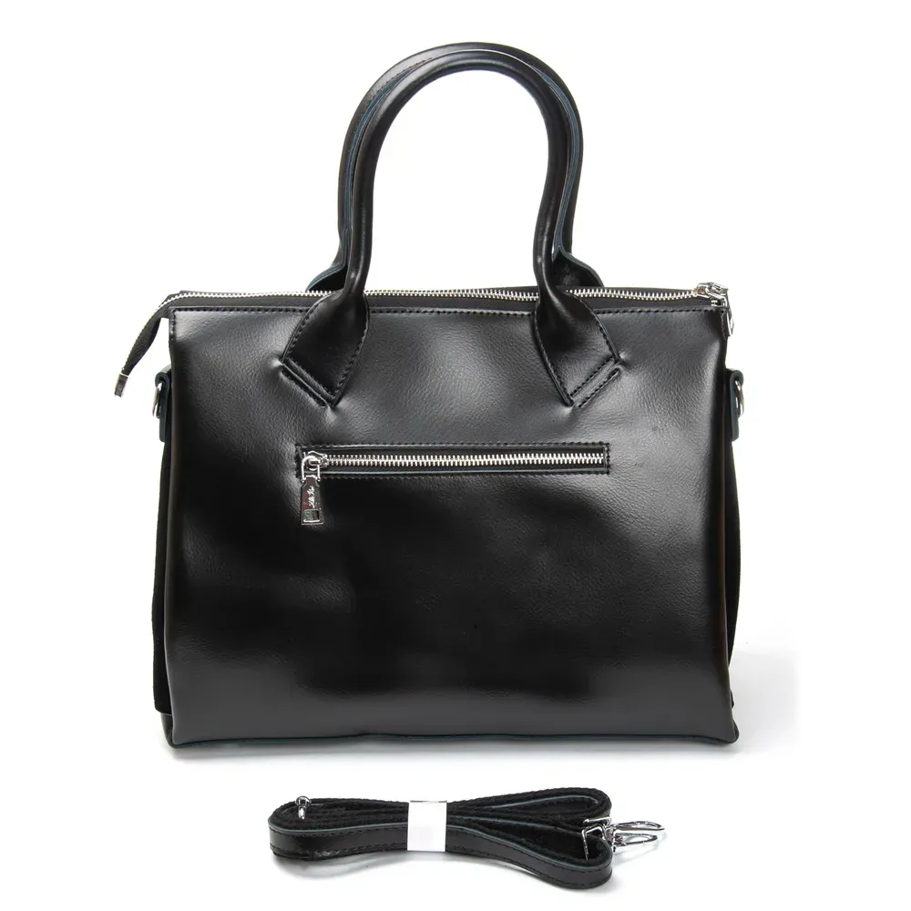 Три отделения, закрываются на общую молнию. Внутри центрального отделения находится боковой двойной открытый карман и карман на молнии. Снаружи сумки на фасаде и на обратной стороне расположены карманы на молнии. Дно сумки жесткое, с металлическими ножками.