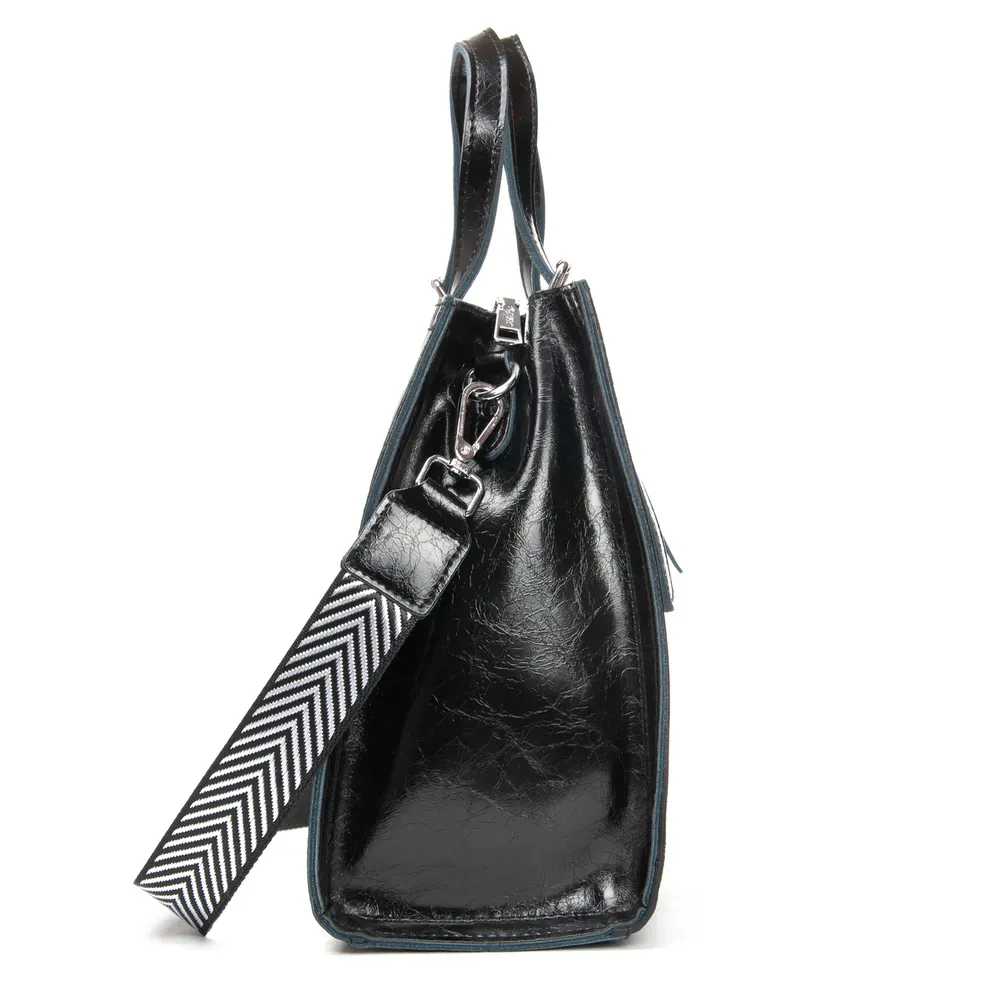 Три отделения: центральное закрывается на молнию, а боковые на магнитную кпопку. Внутри центрального отделения находится боковой двойной открытый карман и карман на молнии. Дно сумки жесткое, с металлическими ножками.