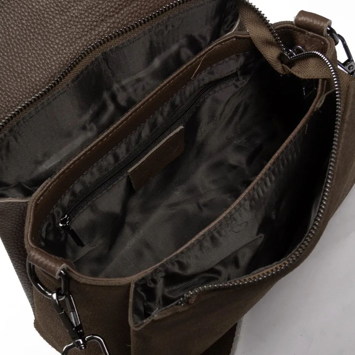 Под клапаном дополнительно закрывается на молнию. Внутри находятся три отделения. Внутри центрального отделения есть боковой карман на молнии и открытый карман. Снаружи сумки на обратной стороне расположен карман на молнии. Клапан закрывается на магнитную кнопку.