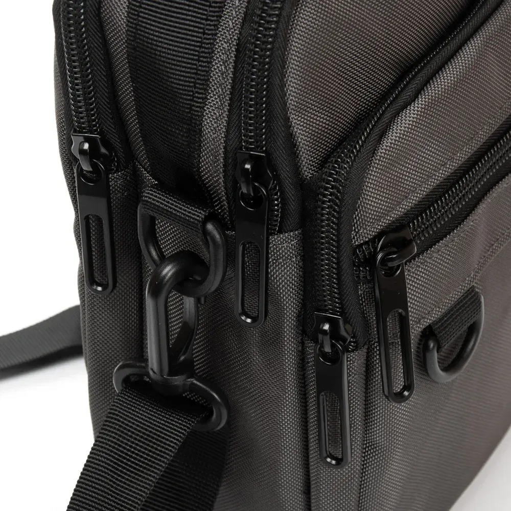 Два отделения, закрываются на молнии. Внутри отделений есть боковой карман на молнии и открытый карман. Снаружи сумки на обратной стороне находится карман на молнии.