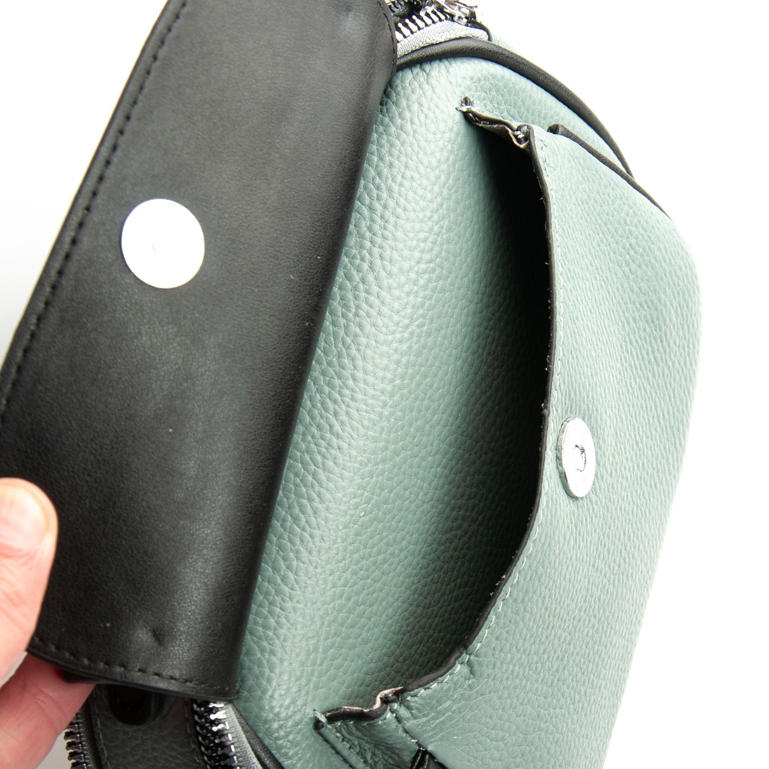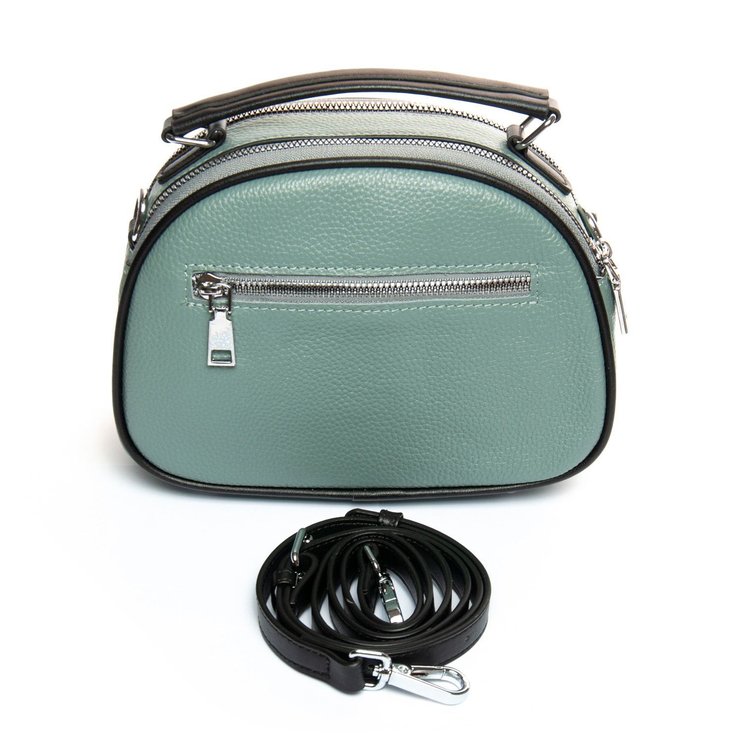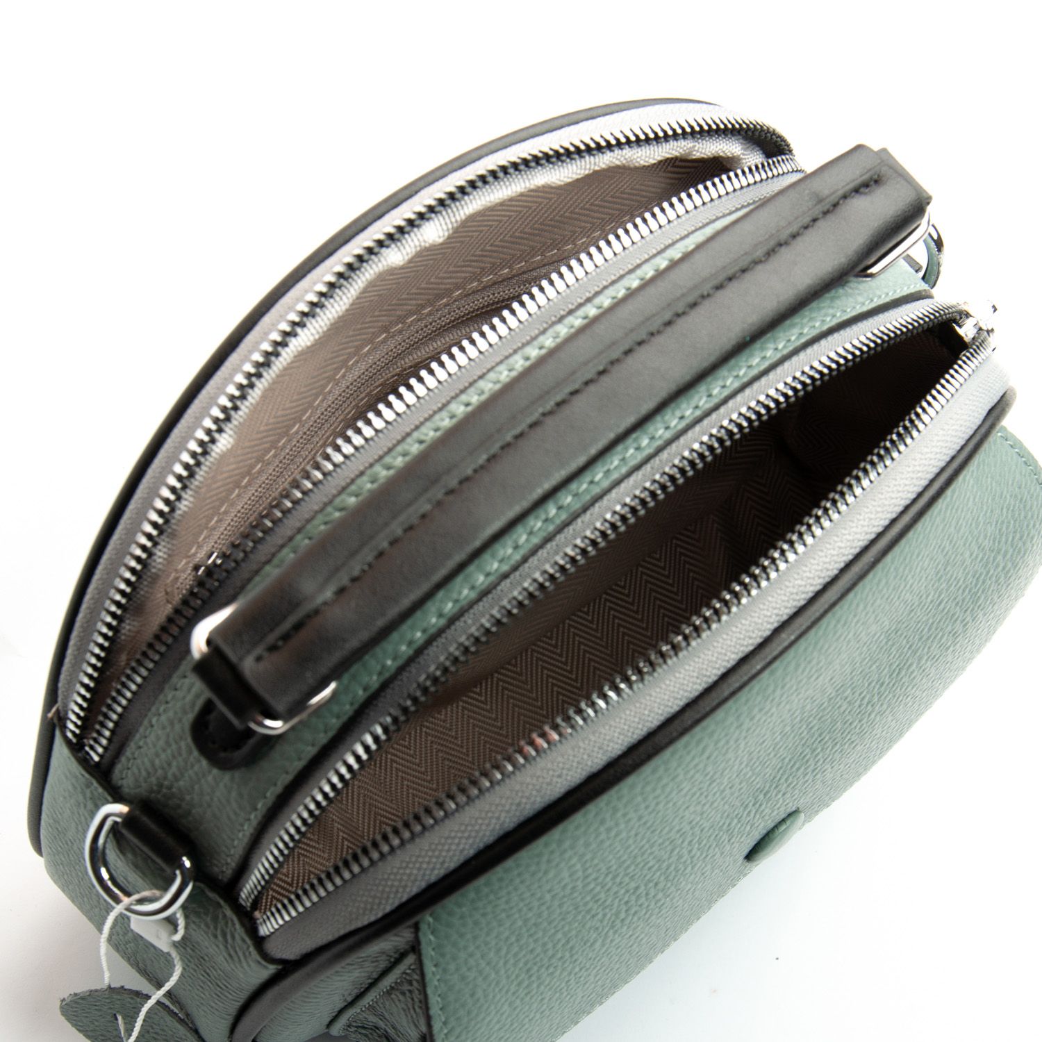 Два отделения, закрываются на молнии. Внутри находится боковой карман на молнии и открытый карман. Снаружи сумочки на фасаде есть карман под клапаном на магнитной кнопке, а на обратной стороне расположен карман на молнии.