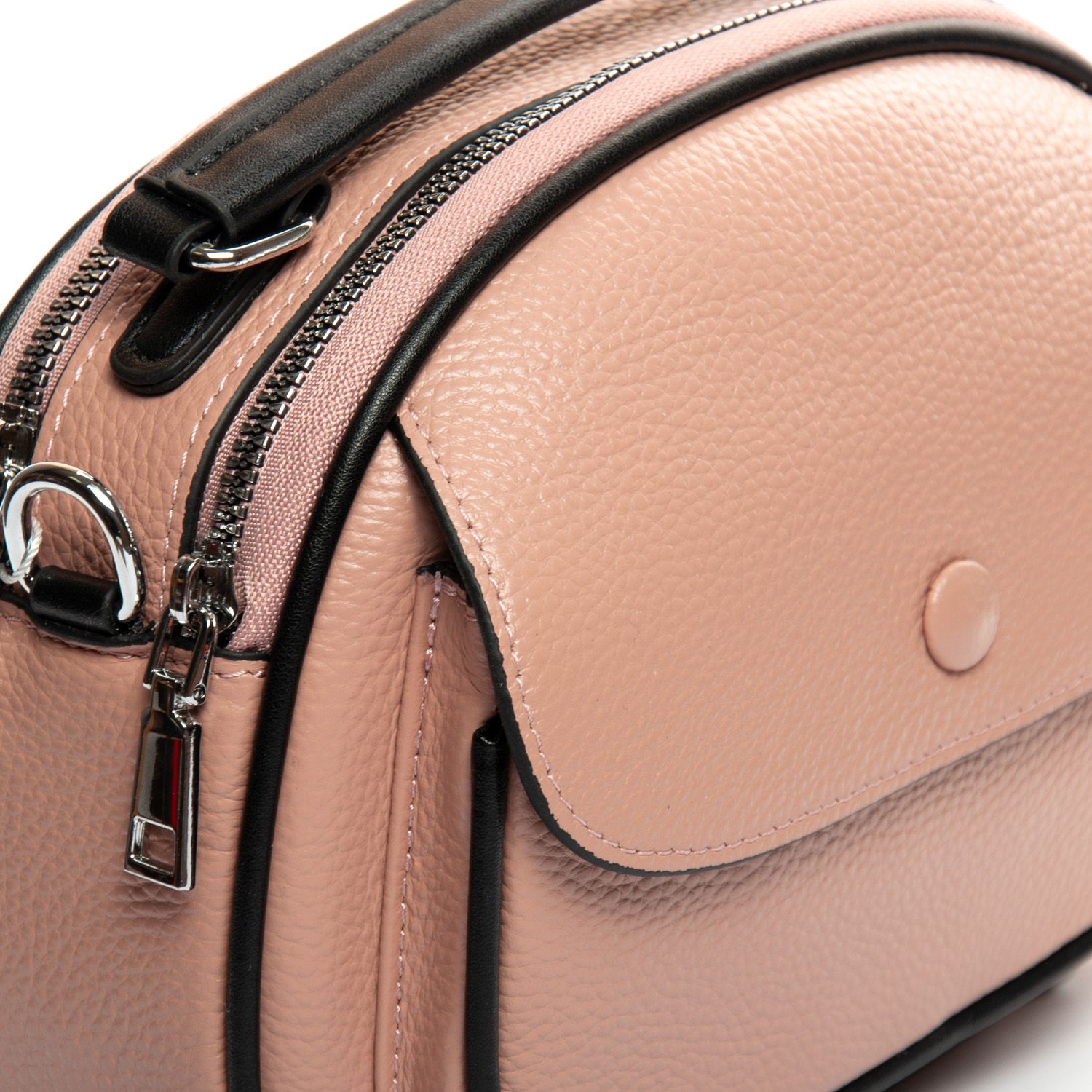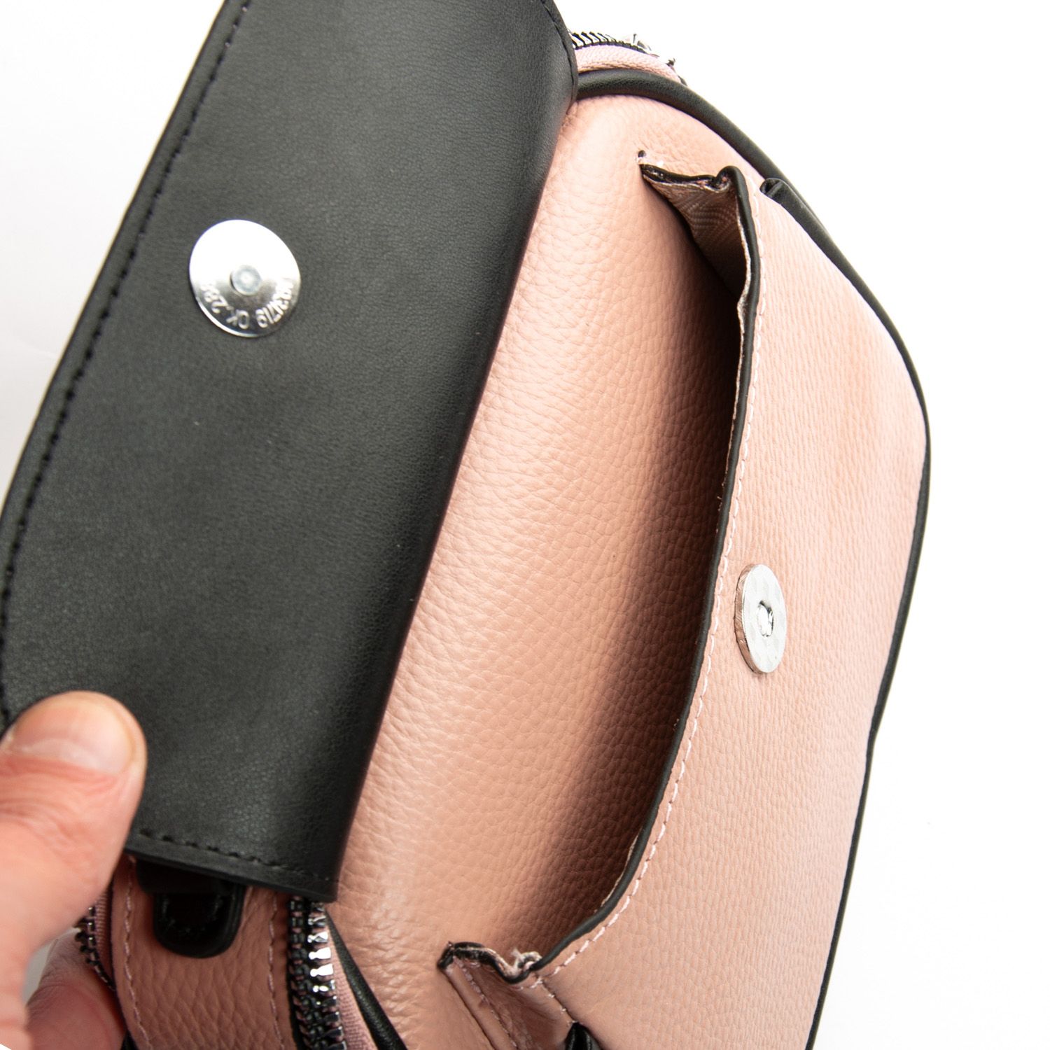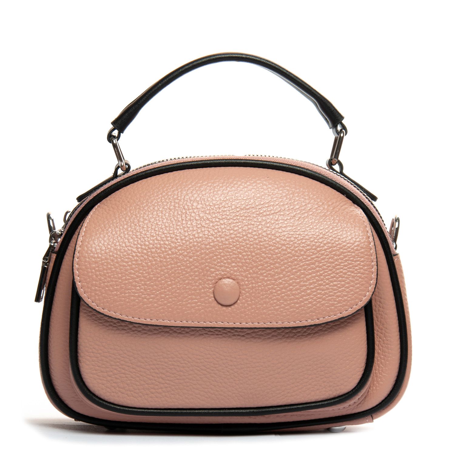 Два отделения, закрываются на молнии. Внутри находится боковой карман на молнии и открытый карман. Снаружи сумочки на фасаде есть карман под клапаном на магнитной кнопке, а на обратной стороне расположен карман на молнии.