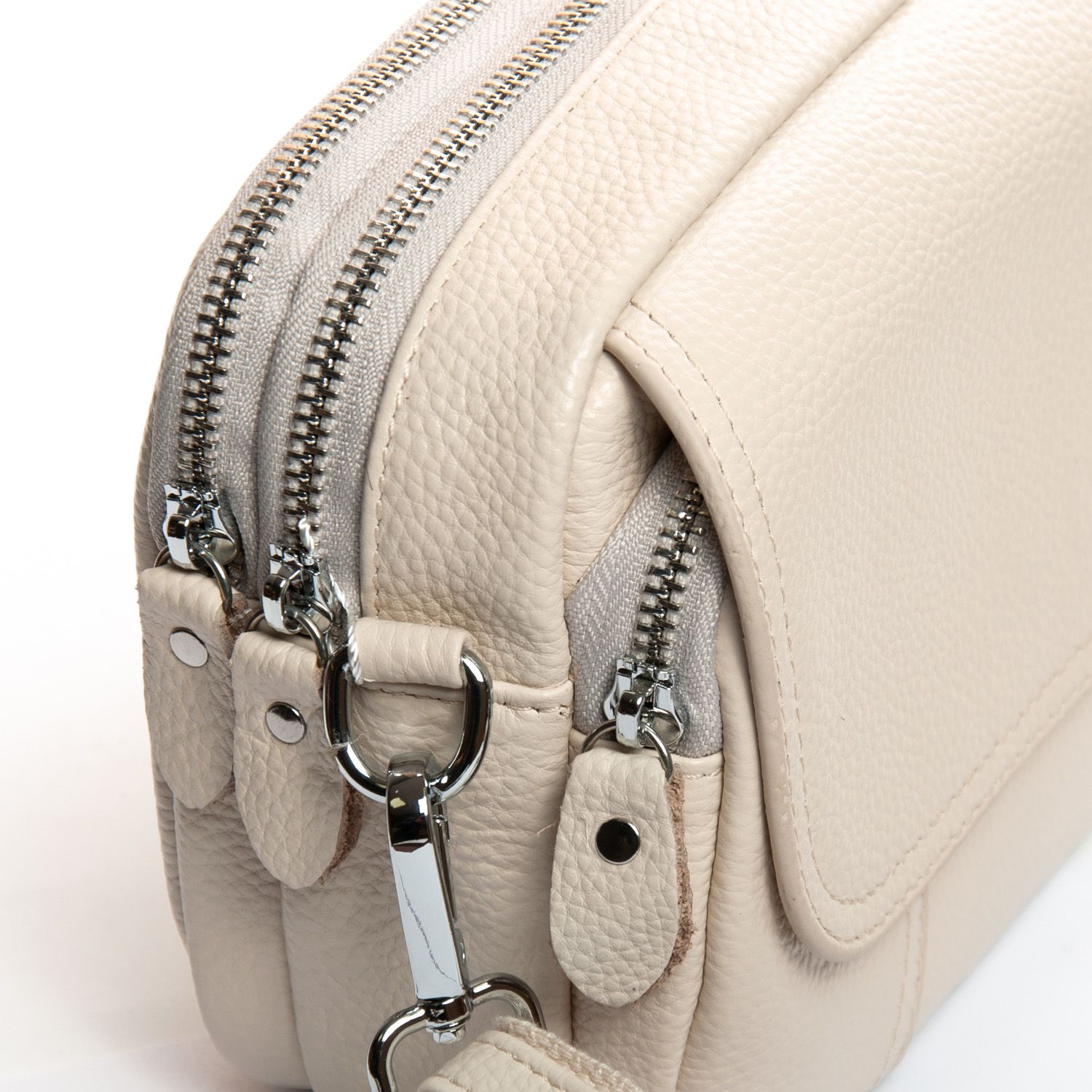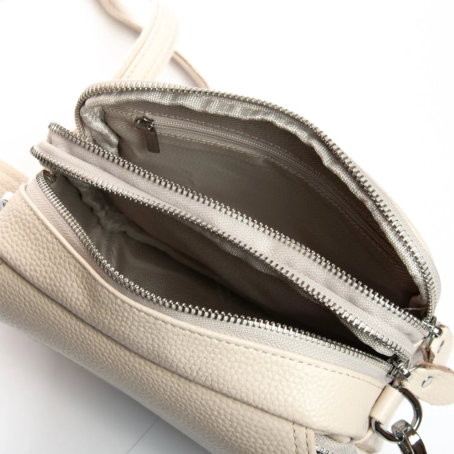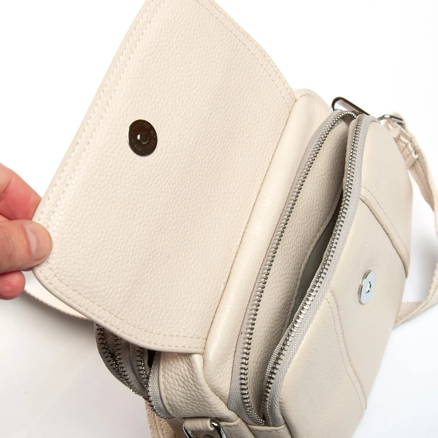 Два отделения, закрываются на молнии. Внутри находится боковой карман на молнии. Снаружи сумочки на фасаде есть карман на молнии и дополнительно под клапаном на магнитной кнопке.