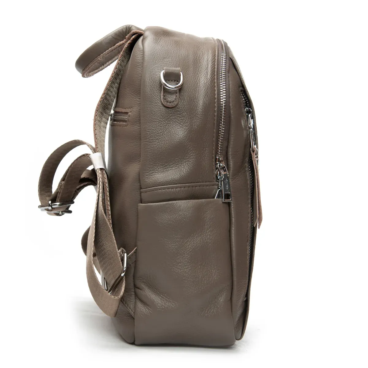 Изготовлена из натуральной мягкой кожи. Можно носить на плече на широком ремне. Закрывается на молнию. Внутри находится основное и дополнительное отделение, разделенное карманом-перегородкой на молнии, открытый карман и карман на молнии. Снаружи рюкзака на фасаде и обратной стороне расположены карманы на молнии. На торцах рюкзака есть небольшие открытые карманы.