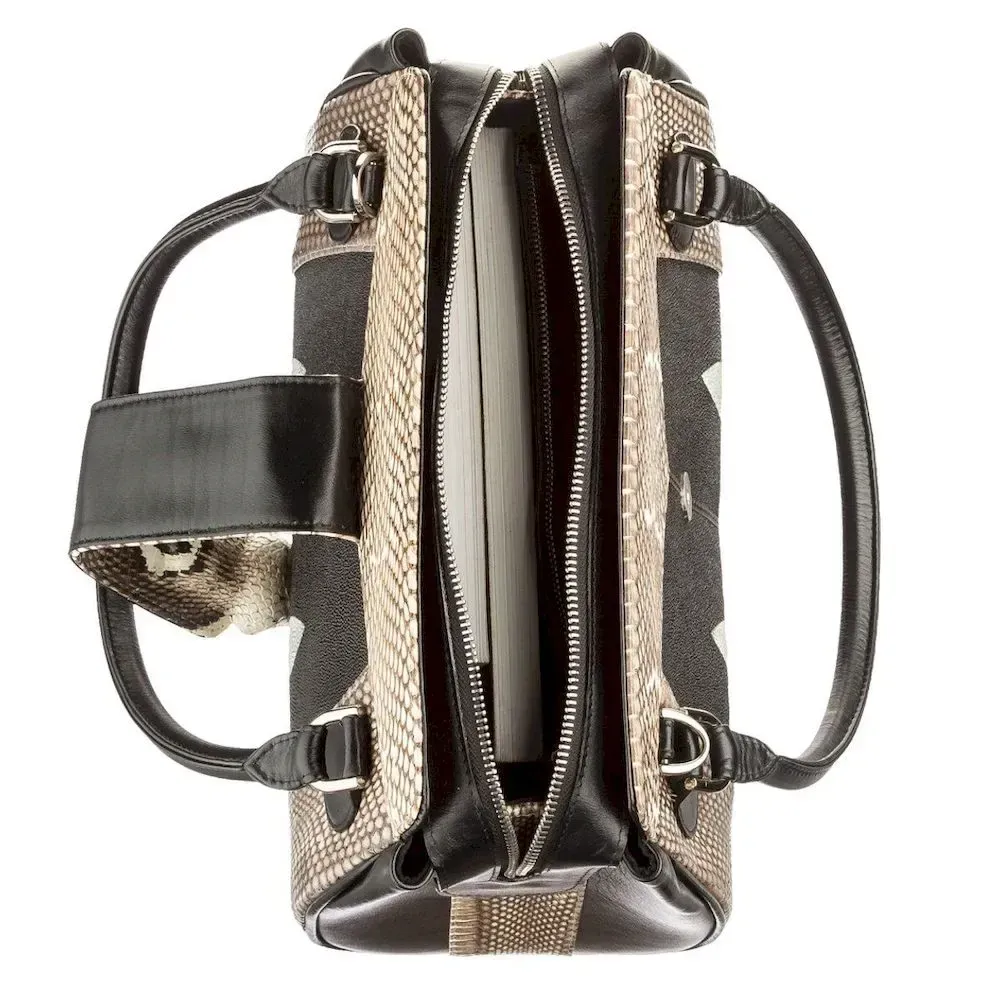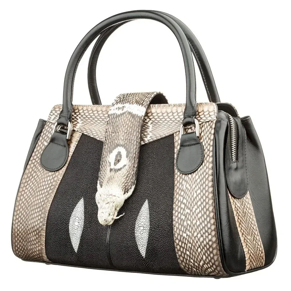 Стильна сумка зі шкіри морського ската зі вставками зі шкіри пітона. Чорний колір є досить універсальним та підійде під будь-який стиль. Містка модель. На дотик відчуваються лусочки зі шкіри пітона, що підтверджує 100% оригінал. Прекрасно сидить у руці, дуже стильно виглядає. Підкреслить ваш образ і виділить вас із натовпу. З такою сумкою ви обов'язково отримаєте море компліментів на свою адресу. Розкішний вибір та висока якість. Родзинкою моделі є голова змії. У комплекті йде чохол для зберігання. Може бути ідеальним подарунком.