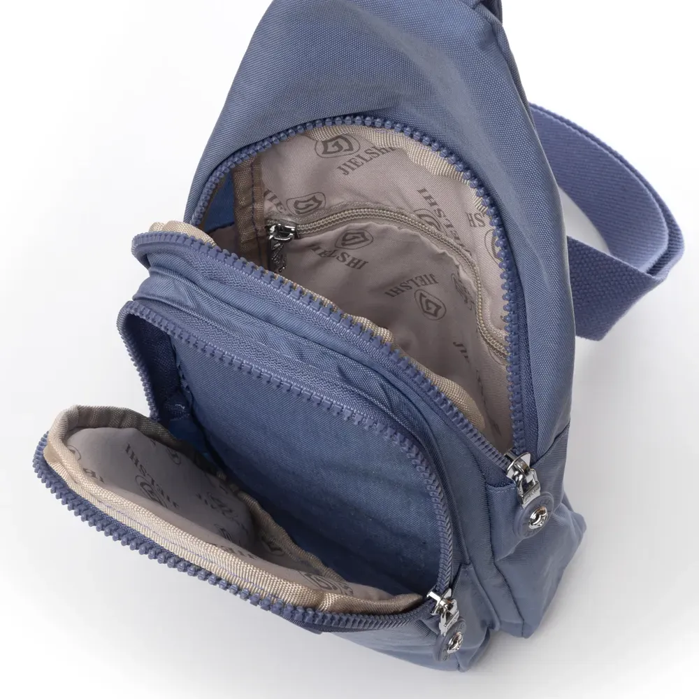 Женская сумочка на плечо Jielshi. Изготовлена из водотталкивающего текстиля. Два отделения, закрываются на молнии. Внутри основного отделения находится большой боковой карман на молнии. На фасаде и обратной стороне сумочки расположены вместительные карманы на молнии.