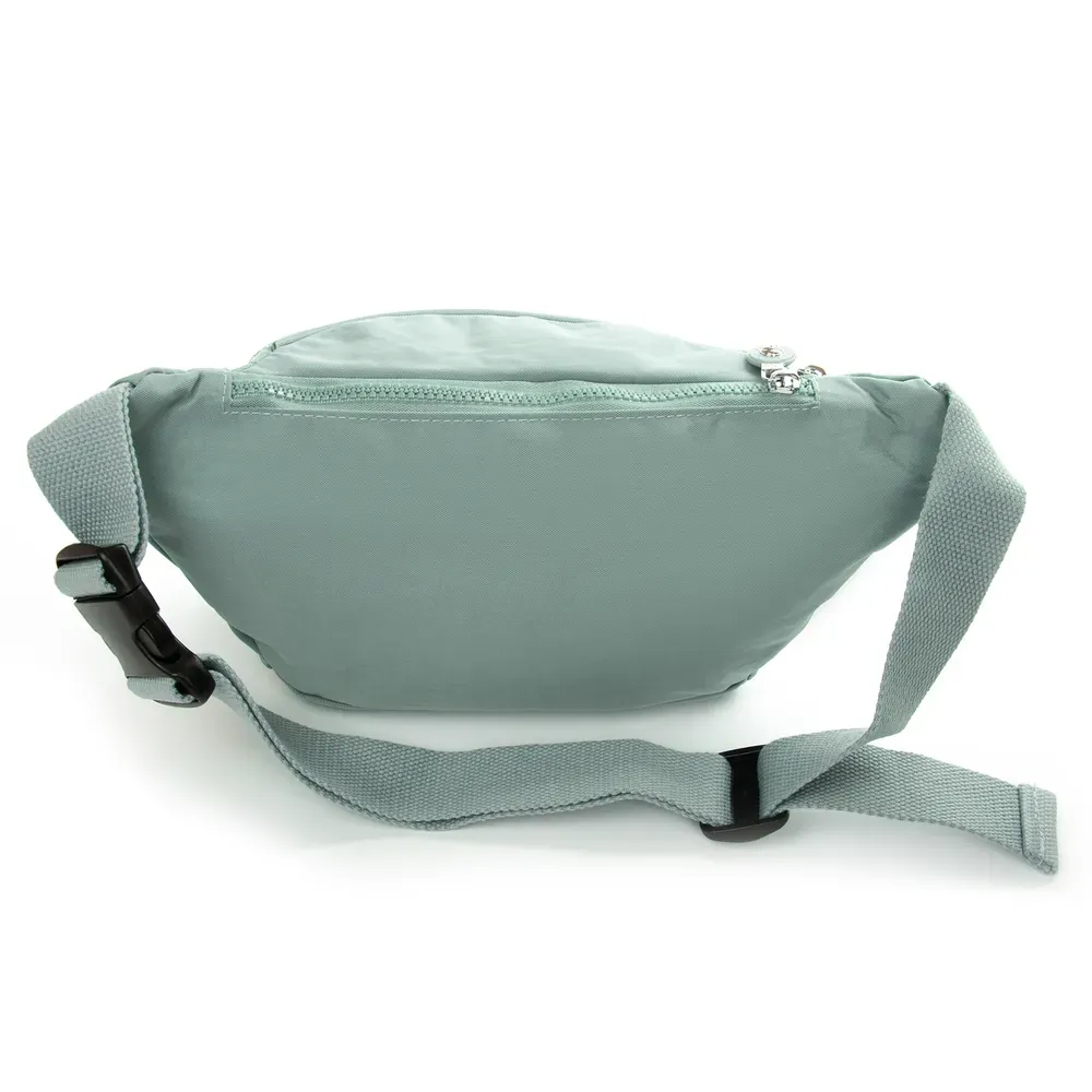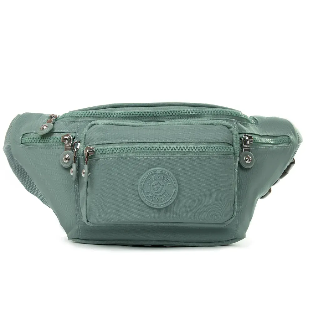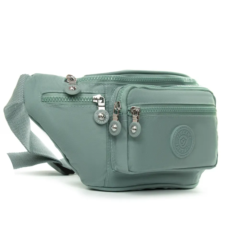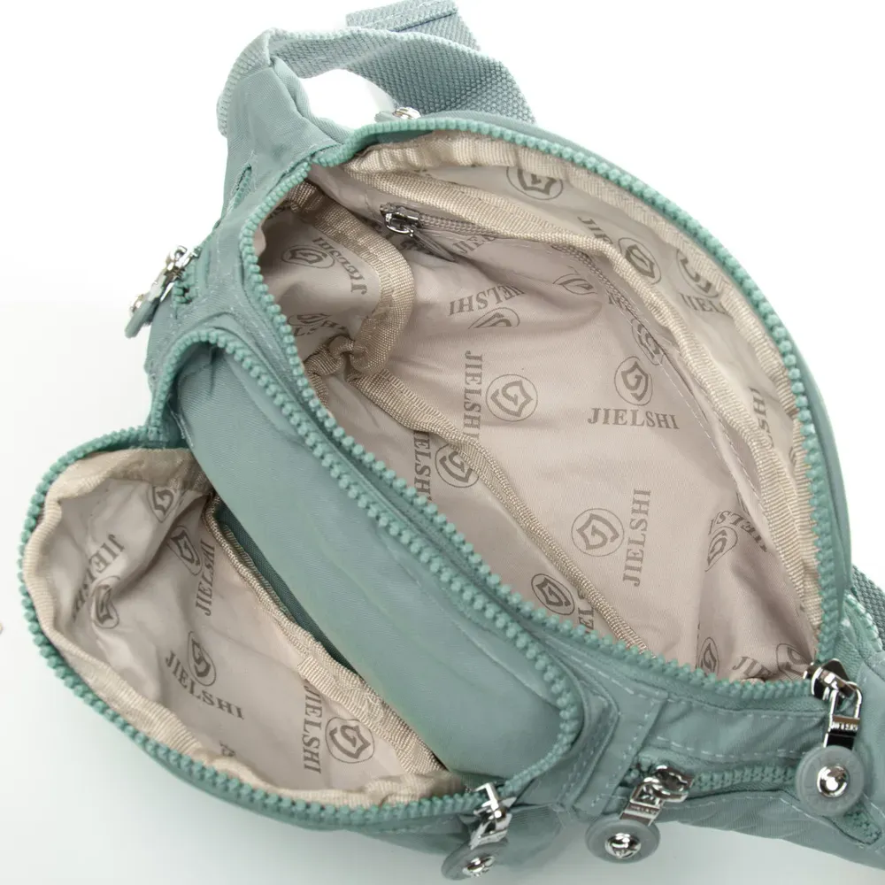 Женская сумочка на пояс Jielshi. Изготовлена из водотталкивающего текстиля. Одно большое отделение, закрывается на молнию. Внутри отделения находится большой боковой карман на молнии. На фасаде и обратной стороне сумочки расположены вместительные карманы на молнии.