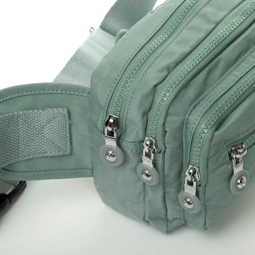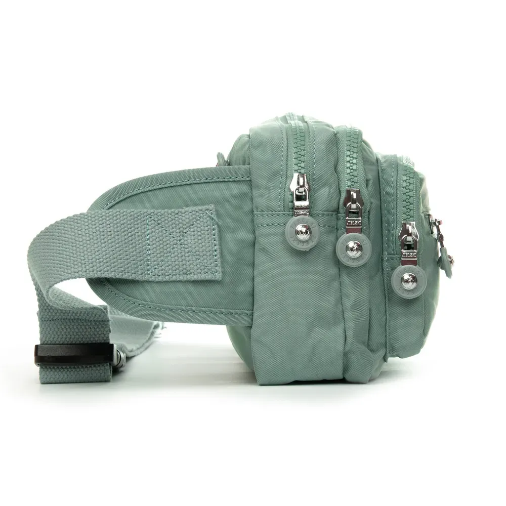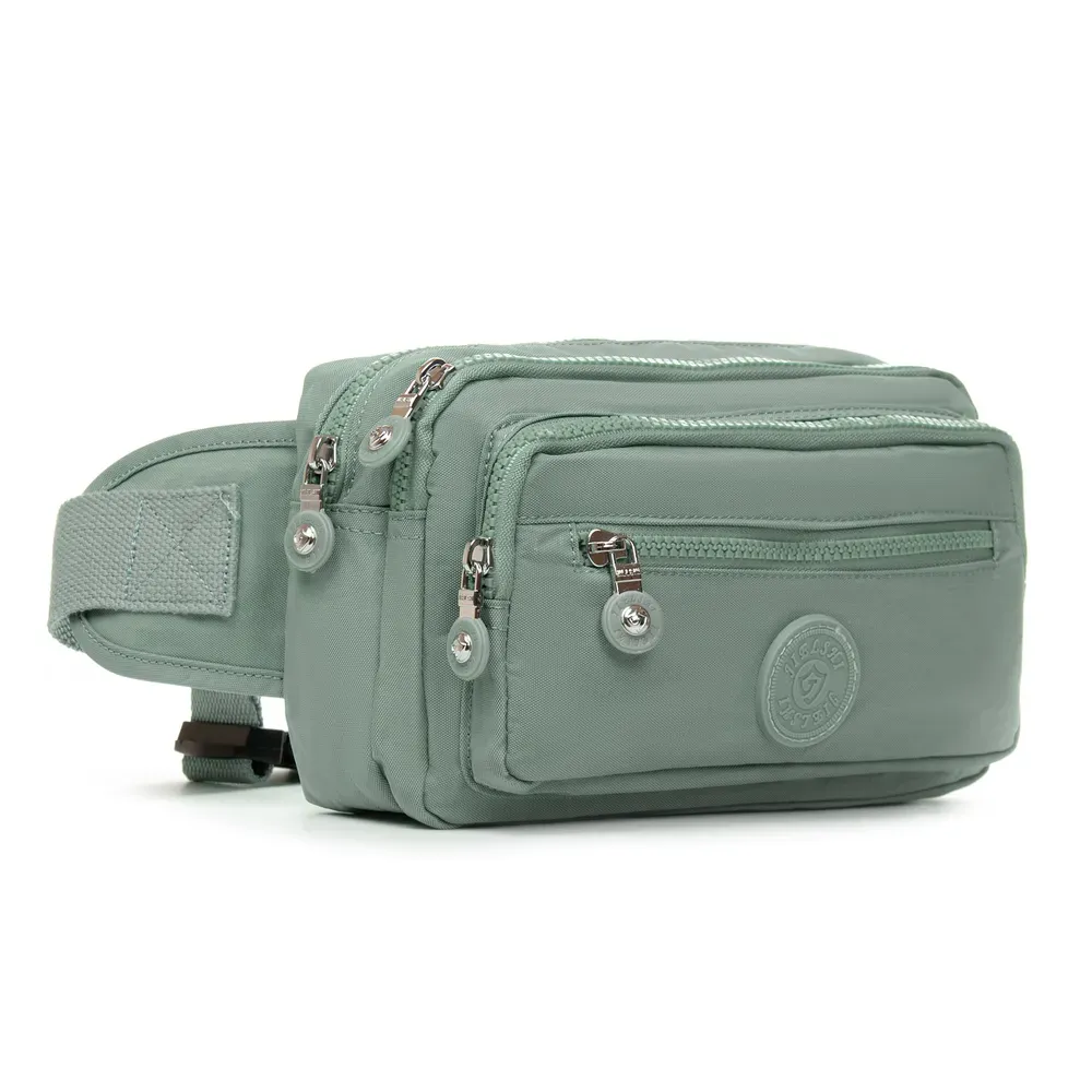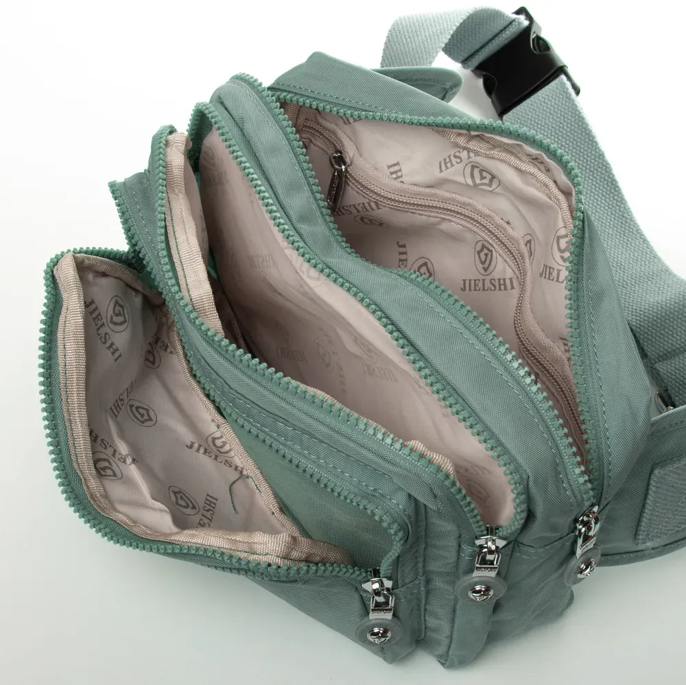 Женская сумочка на пояс Jielshi. Изготовлена из водотталкивающего текстиля. Три отделения, закрываются на молнии. Внутри одного отделения находится большой боковой карман на молнии. На фасаде и обратной стороне сумочки расположены вместительные карманы на молнии.