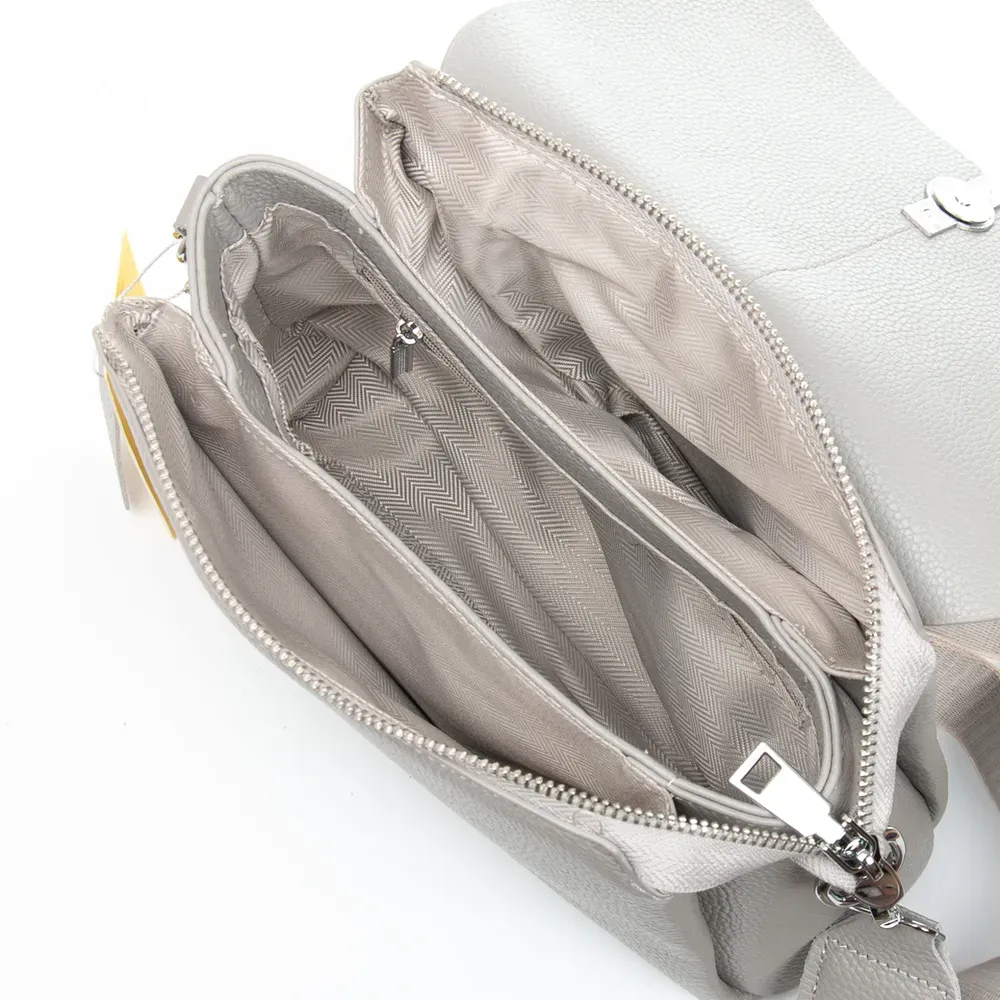 Жіноча сумочка крос боді. Виготовлена з водовідштовхувального текстилю. Два відділення, що закриваються на блискавку. Усередині є бічна кишеня на блискавці. На фасаді та на звороті знаходяться місткі кишені на блискавці.