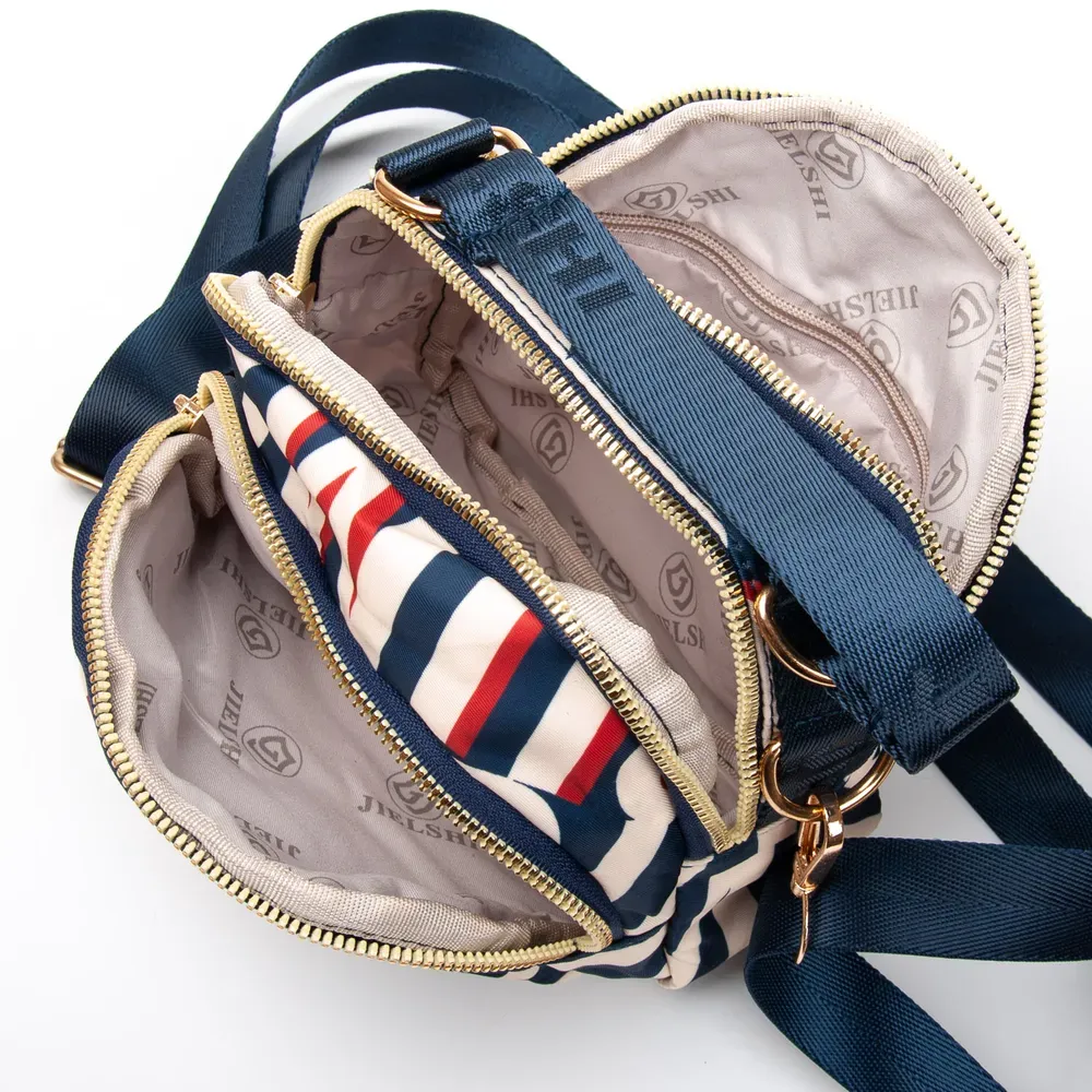 Женская сумочка кросс боди Jielshi. Изготовлена из водотталкивающего текстиля. Два отделения, закрываются на молнии. Внутри есть боковой карман на молнии и открытый карман. На фасаде расположен вместительный карман на молнии.