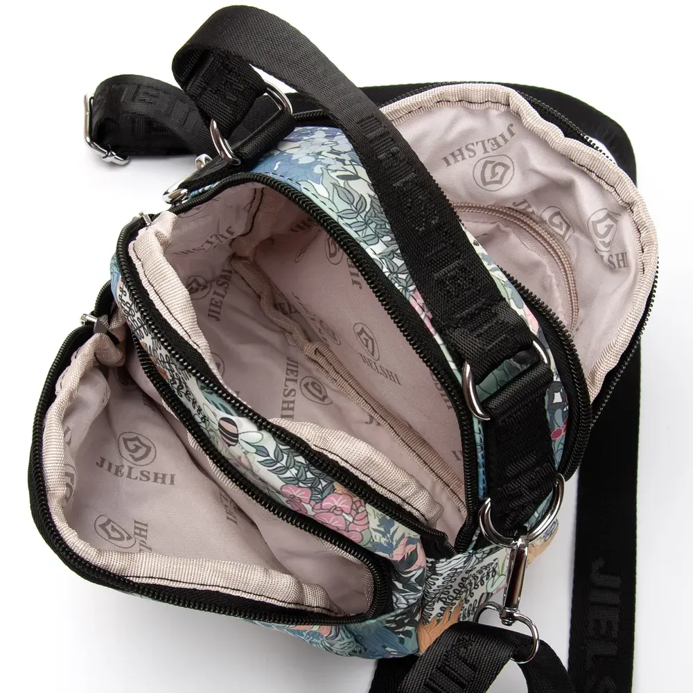 Женская сумочка кросс боди Jielshi. Изготовлена из водотталкивающего текстиля. Два отделения, закрываются на молнии. Внутри есть боковой карман на молнии и открытый карман. На фасаде расположен вместительный карман на молнии.