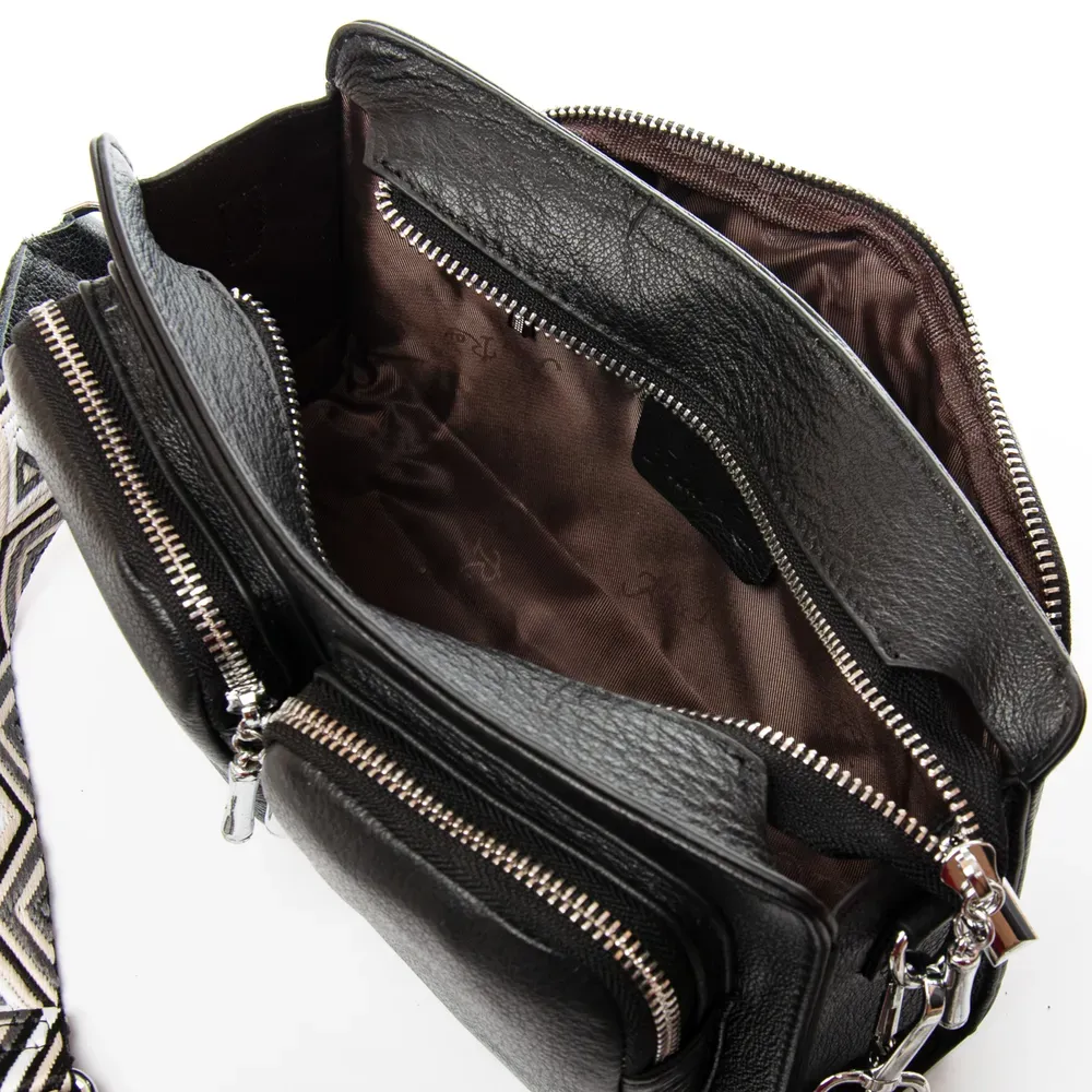 Жіноча сумочка крос боді. Виготовлена з водовідштовхувального текстилю. Два відділення, закриваються на блискавку. Усередині є бічна кишеня на блискавці та відкрита кишеня з безліччю відсіків для візитних карток. На фасаді та на звороті знаходяться місткі кишені на блискавці.