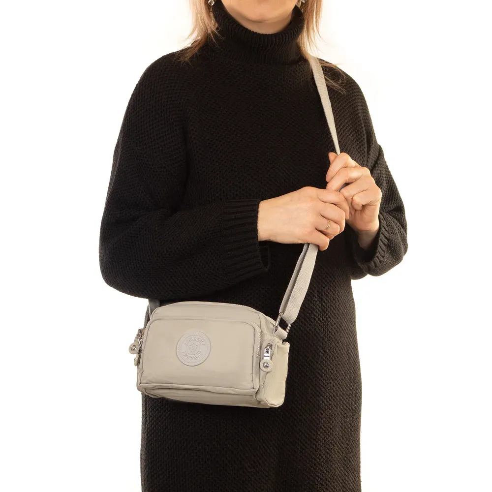 Женская сумочка кросс боди. Изготовлена из водотталкивающего текстиля. Одно отделение, закрывается на молнию. Внутри есть боковой карман на молнии и открытый карман. На фасаде и на обратной стороне находятся вместительные карманы на молнии. А на торцах расположены маленькие кармашки на молнии
