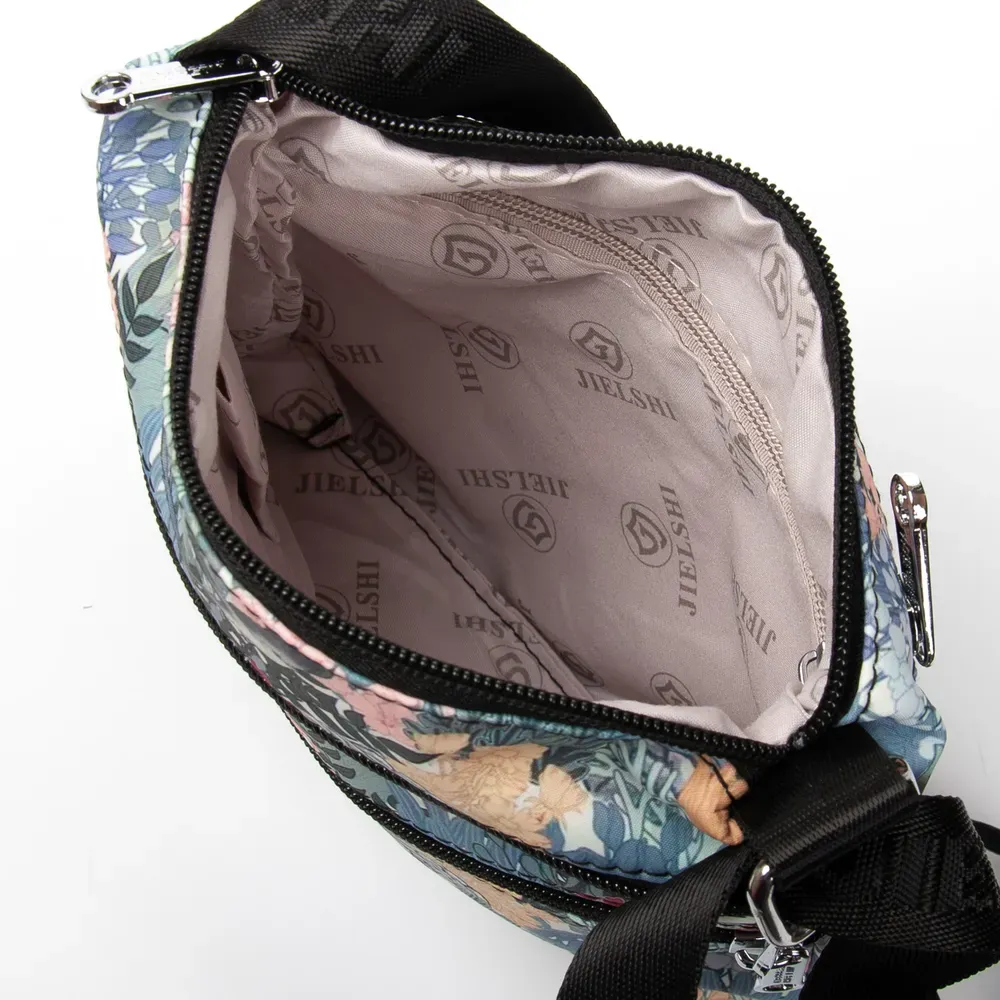 Женская сумочка кросс боди Jielshi. Изготовлена из водотталкивающего текстиля. Одно основное отделение, закрывается на молнию. Внутри есть боковой карман на молнии и открытый двойной карман. На фасаде и на обратной стороне расположены вместительные карманы на молнии.
