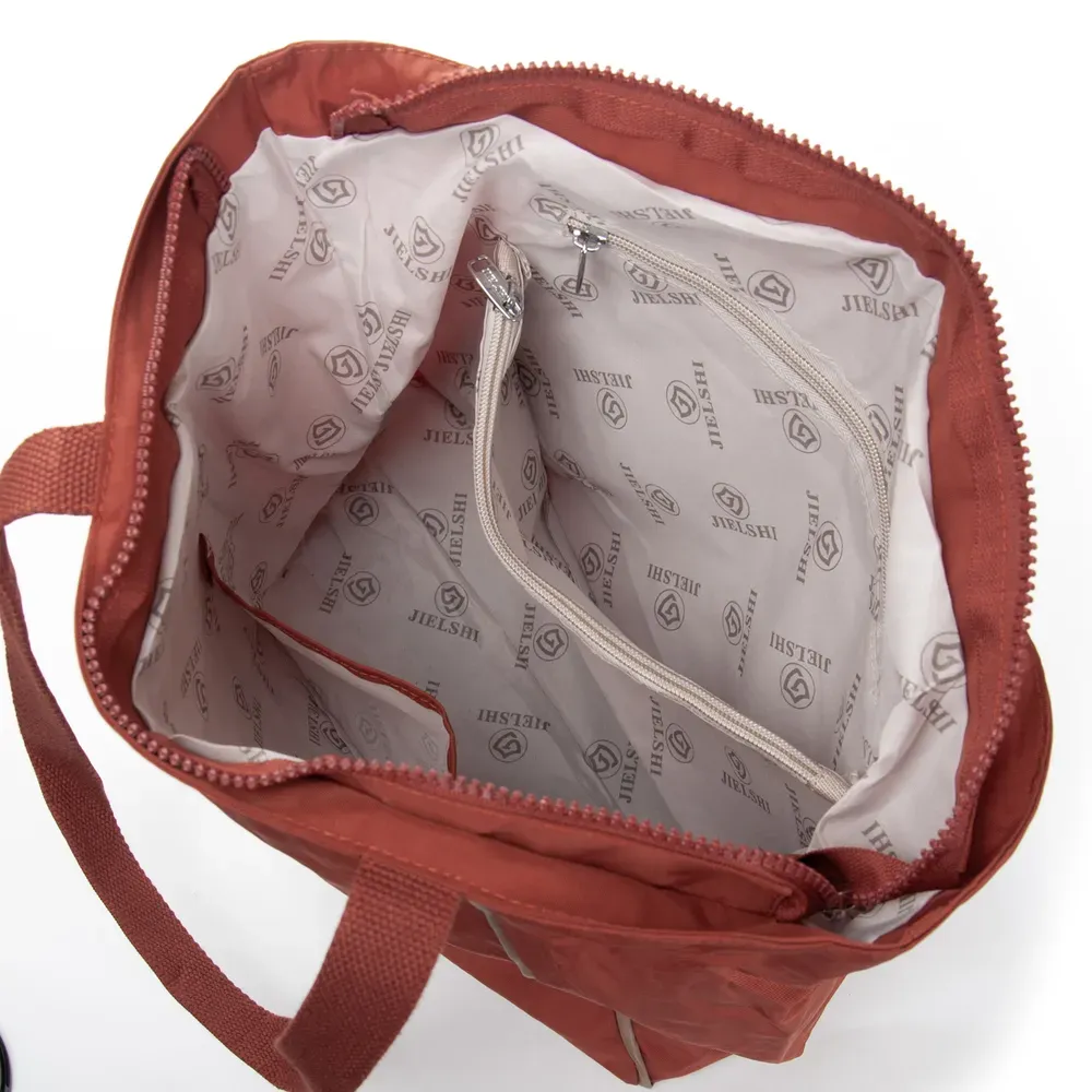 Женская сумка-шоппер Jielshi. Изготовлена из водоотталкивающего текстиля. Закрывается на молнию. Внутри находится основное и дополнительное отделения, разделенные карманом-перегородкой на молнии, большой боковой карман на молнии и открытый карман. На обратной стороне сумки находится вместительный карман на молнии.