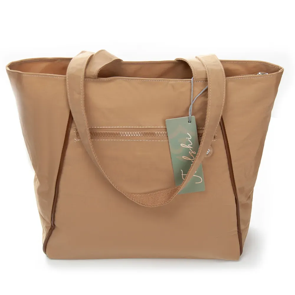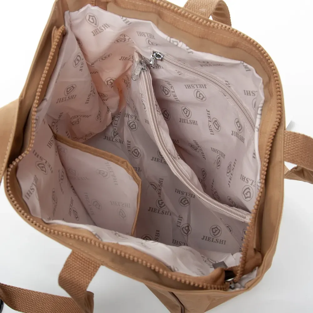Женская сумка-шоппер Jielshi. Изготовлена из водоотталкивающего текстиля. Закрывается на молнию. Внутри находится основное и дополнительное отделения, разделенные карманом-перегородкой на молнии, большой боковой карман на молнии и открытый карман. На обратной стороне сумки находится вместительный карман на молнии.