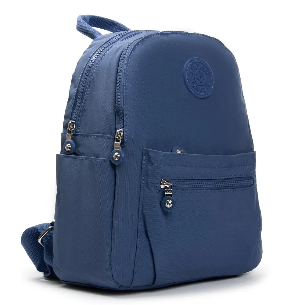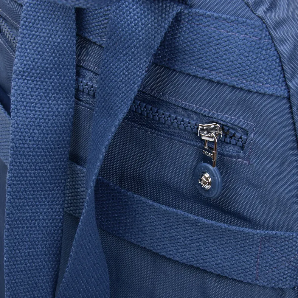 Женский рюкзак. Изготовлен из водотталкивающего текстиля. Два отделения, закрываются на молнии. В основном отделении есть карман-перегородка на молнии и большой боковой карман на молнии. На фасаде и обратной стороне рюкзака находятся вместительные карманы на молнии. А на торцах есть открытые небольшие карманы. На обратной стороне рюкзака также есть крепление на ручку чемодана.