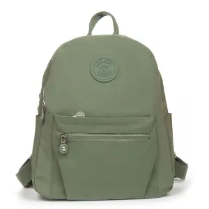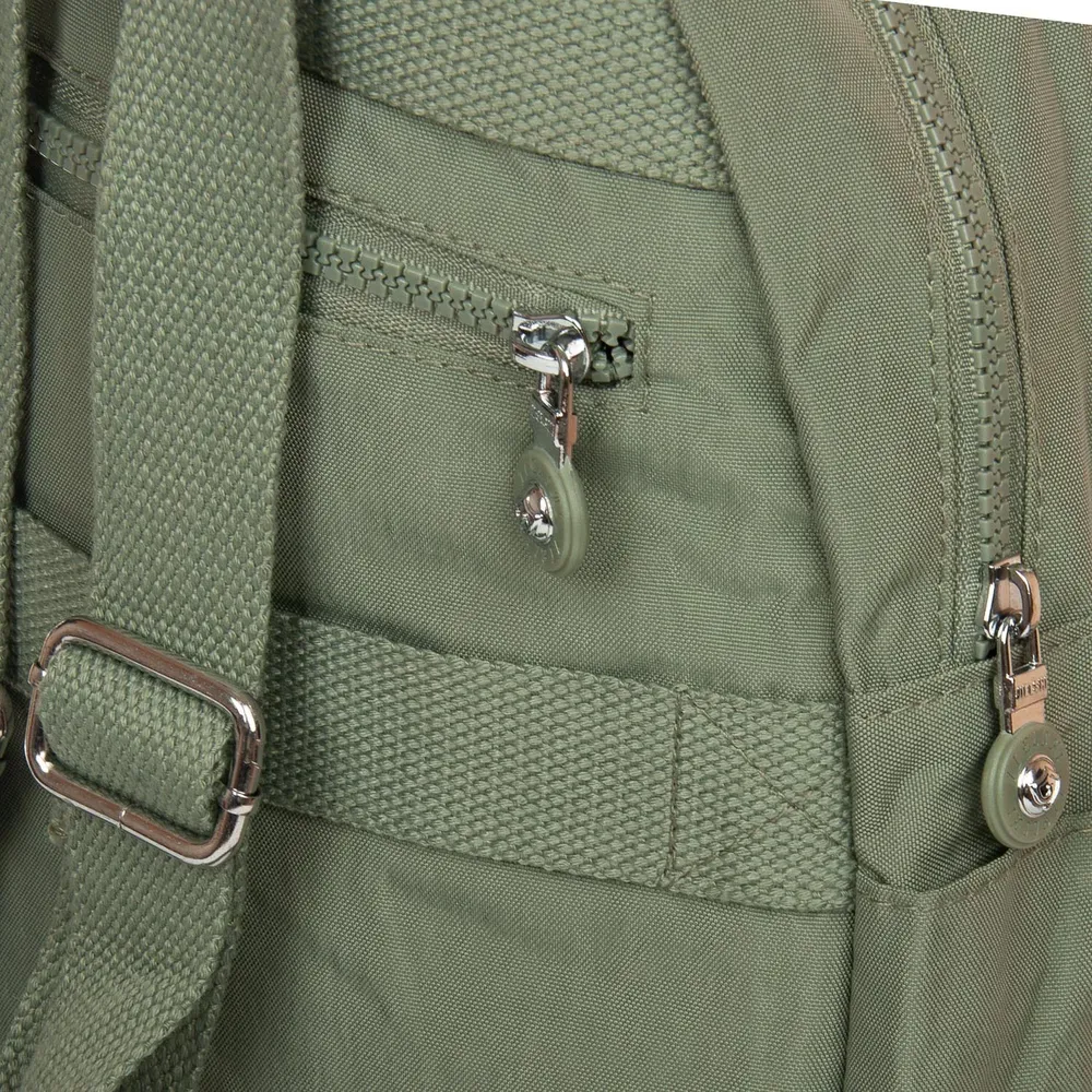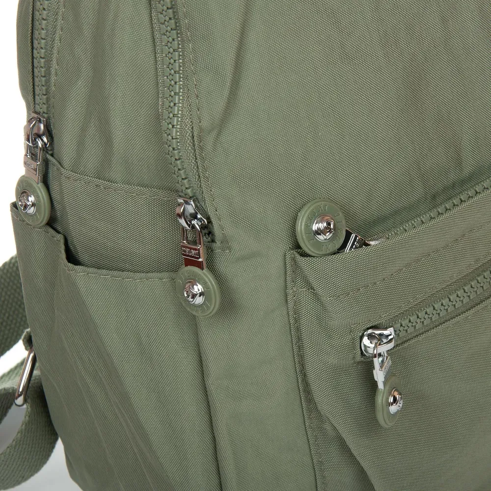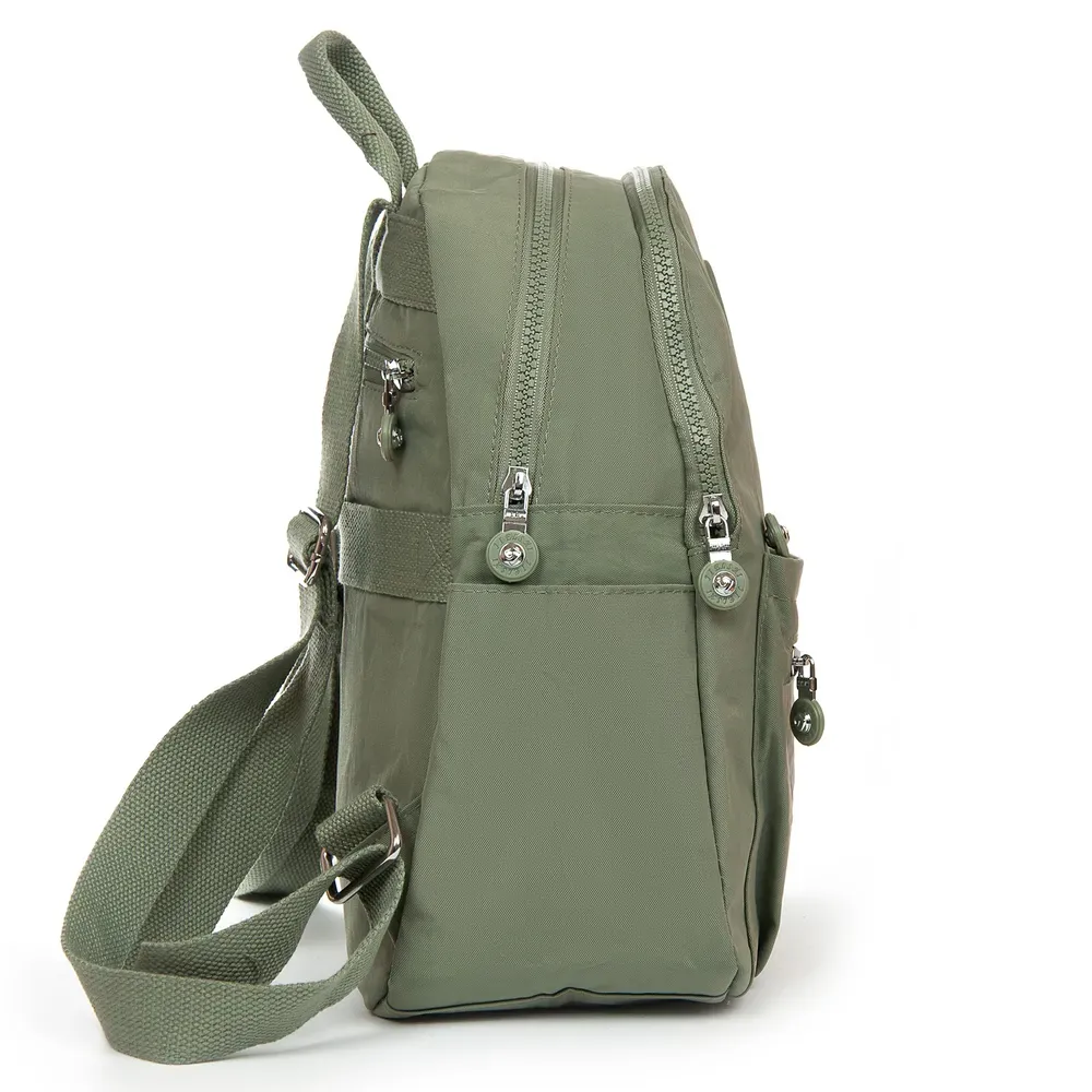 Женский рюкзак. Изготовлен из водотталкивающего текстиля. Два отделения, закрываются на молнии. В основном отделении есть карман-перегородка на молнии и большой боковой карман на молнии. На фасаде и обратной стороне рюкзака находятся вместительные карманы на молнии. А на торцах есть открытые небольшие карманы. На обратной стороне рюкзака также есть крепление на ручку чемодана.