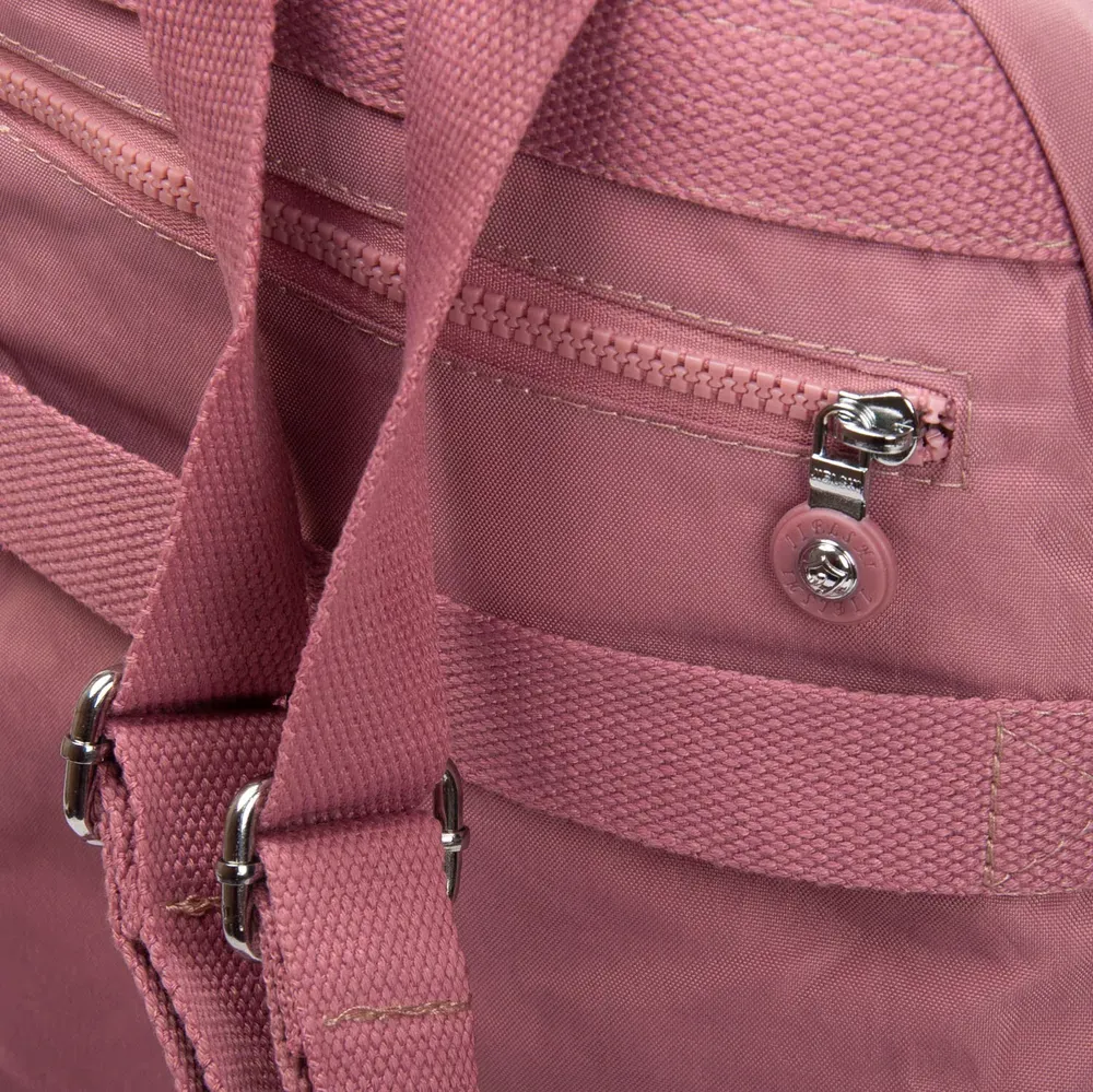 Женский рюкзак. Изготовлен из водотталкивающего текстиля. Два отделения, закрываются на молнии. В основном отделении есть карман-перегородка на молнии и большой боковой карман на молнии. На фасаде и обратной стороне рюкзака находятся вместительные карманы на молнии. А на торцах есть открытые небольшие карманы. На обратной стороне рюкзака также есть крепление на ручку чемодана.