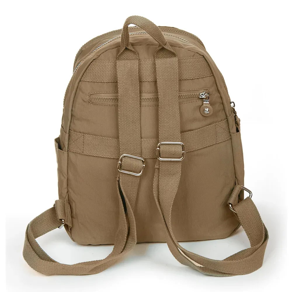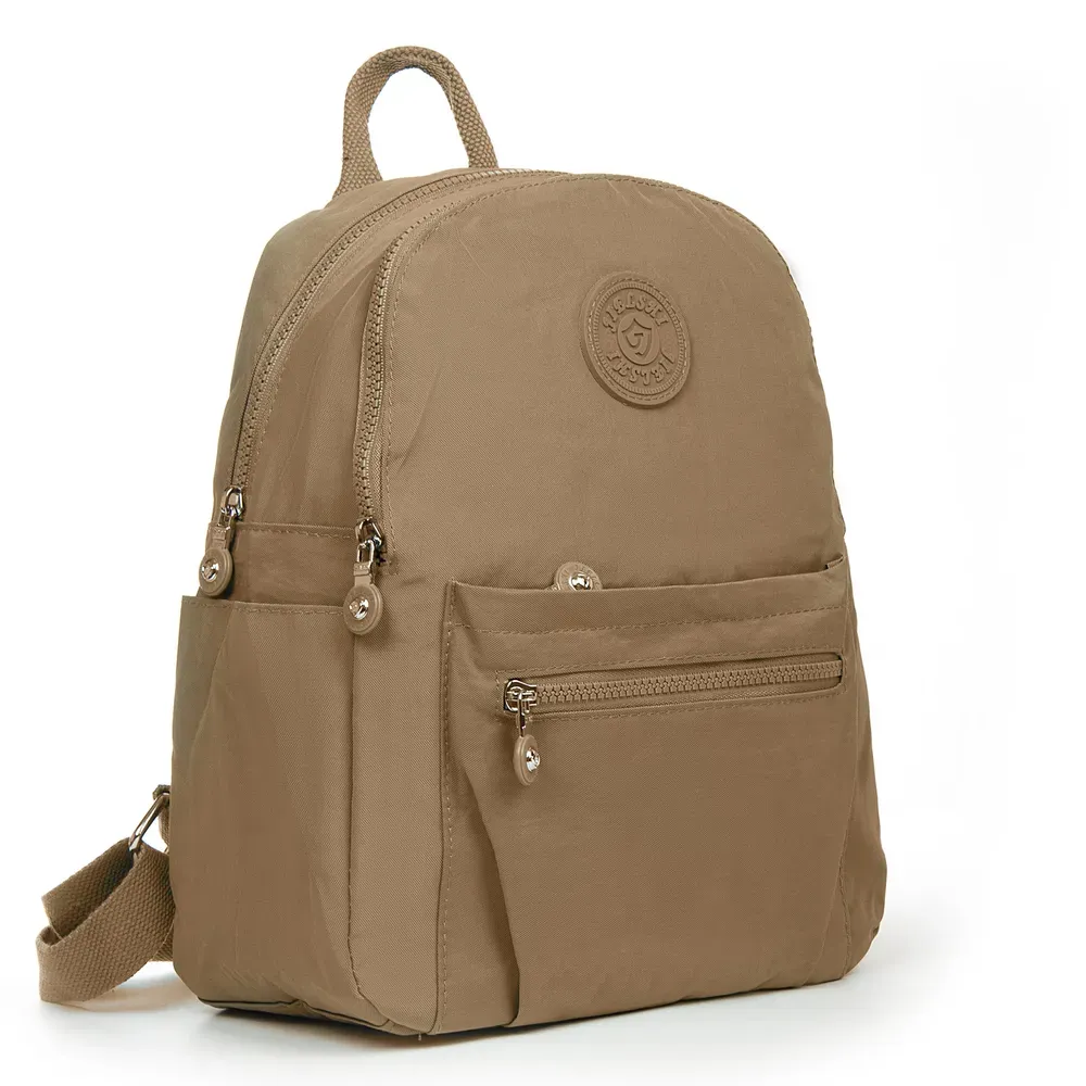 Женский рюкзак. Изготовлен из водотталкивающего текстиля. Два отделения, закрываются на молнии. В основном отделении есть карман-перегородка на молнии и большой боковой карман на молнии. На фасаде и обратной стороне рюкзака находятся вместительные карманы на молнии. А на торцах есть открытые небольшие карманы. На обратной стороне рюкзака также есть крепление на ручку чемодана.