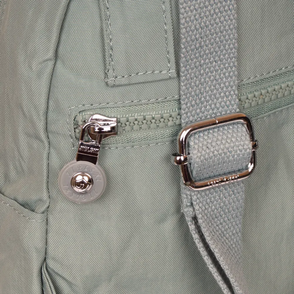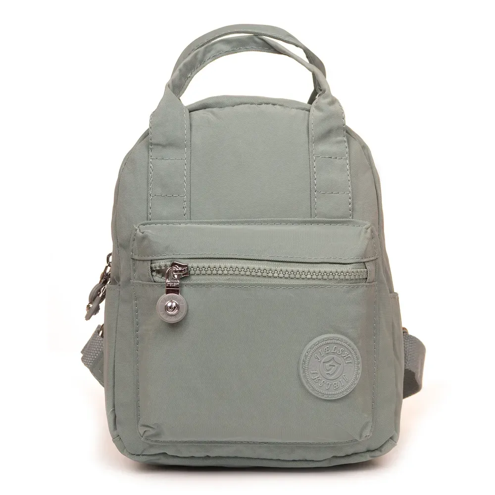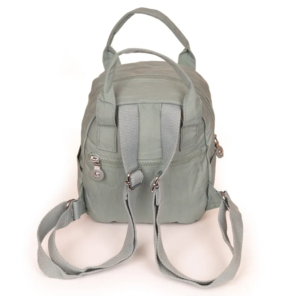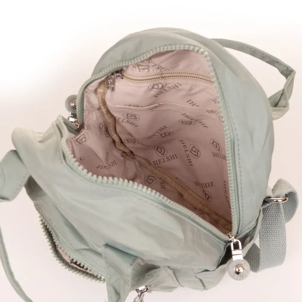 Женская сумочка - рюкзак. Изготовлена из водотталкивающего текстиля. Одно отделение, закрывается на молнию. Внутри есть боковой карман на молнии и открытый карман. На фасаде и обратной стороне рюкзака находятся вместительные карманы на молнии. А на торцах есть открытые небольшие карманы.