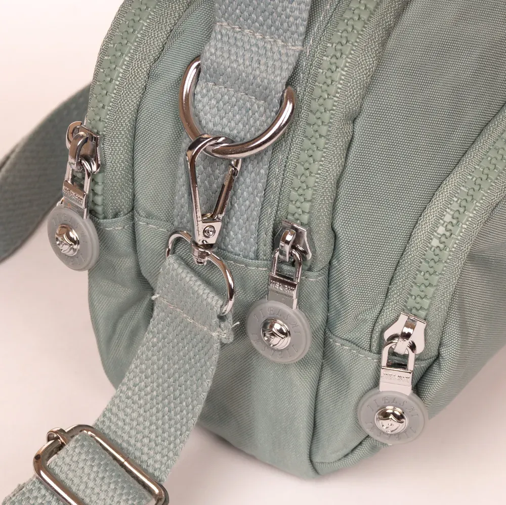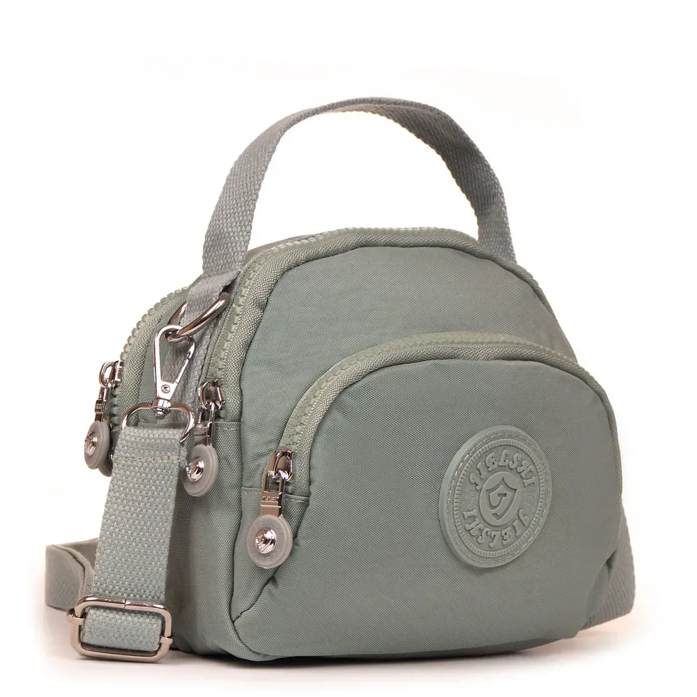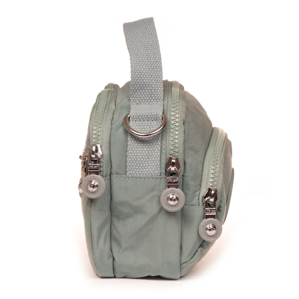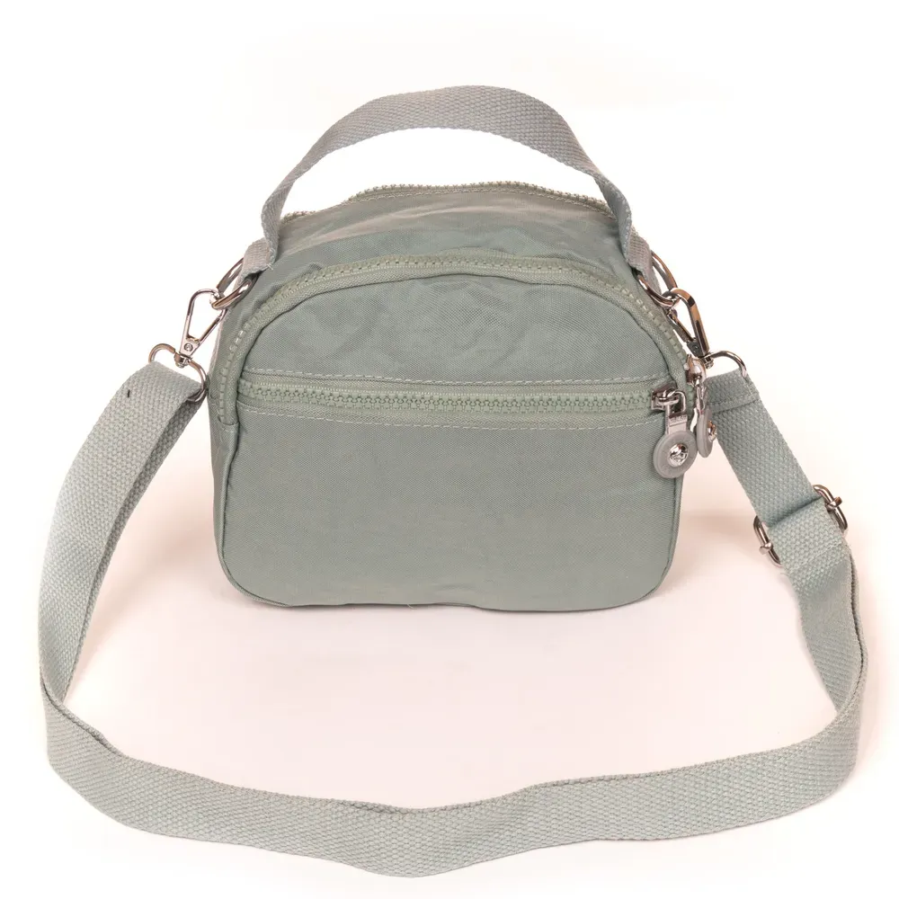 Женская сумочка кросс боди. Изготовлена из водотталкивающего текстиля. Два отделения, закрываются на молнию. Внутри есть боковой карман на молнии и открытый карман. На фасаде и на обратной стороне находятся вместительные карманы на молнии.