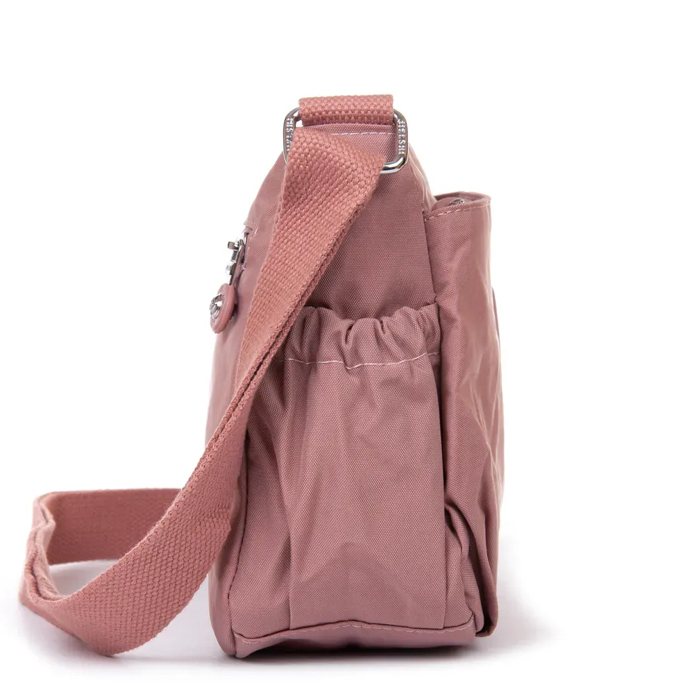 Жіноча сумочка крос боді. Виготовлена з водовідштовхувального текстилю. Три відділення, що закриваються на блискавку. Усередині є бічна кишеня на блискавці. На фасаді та на звороті розташовані місткі кишені на магнітній кнопці.