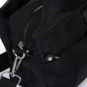 Жіноча сумочка крос боді. Виготовлена з водовідштовхувального текстилю. Три відділення, що закриваються на блискавку. Усередині є бічна кишеня на блискавці та відкрита кишеня. На фасаді та на звороті знаходяться місткі кишені на блискавці.