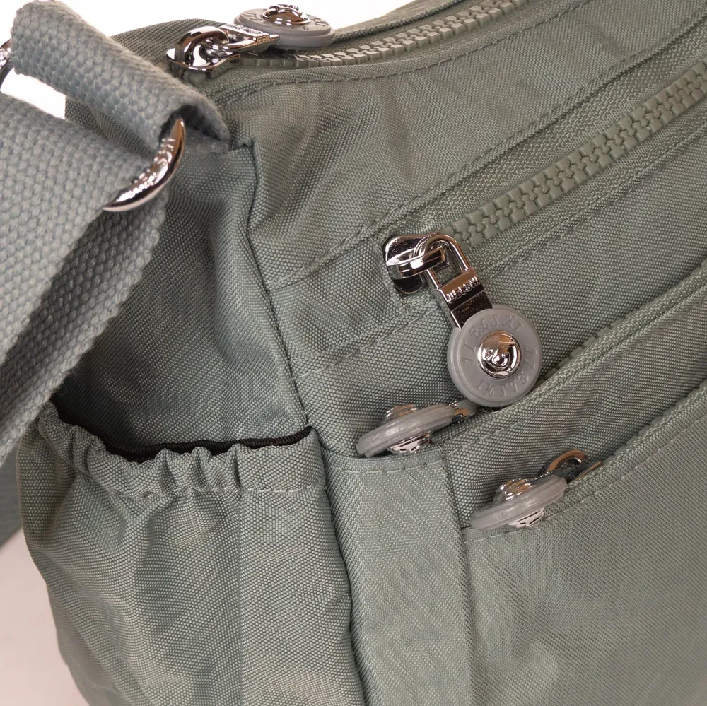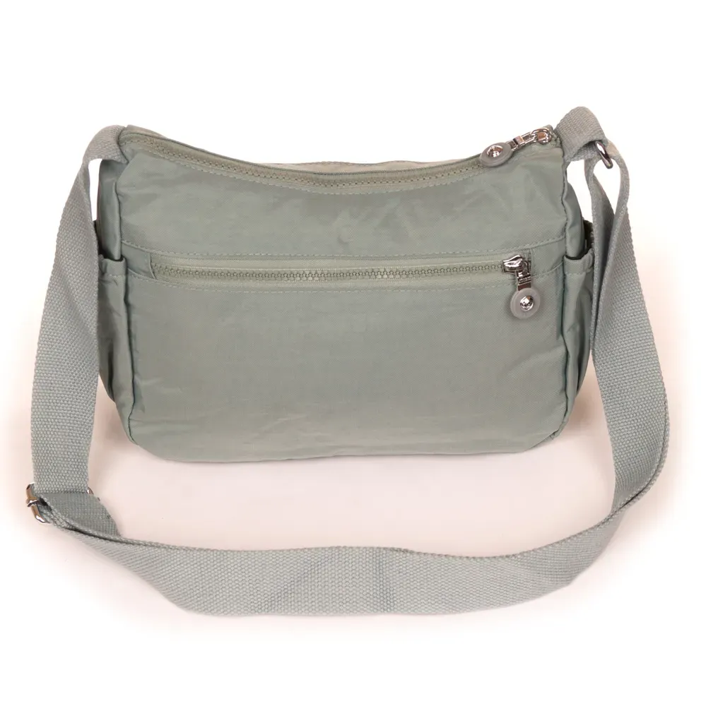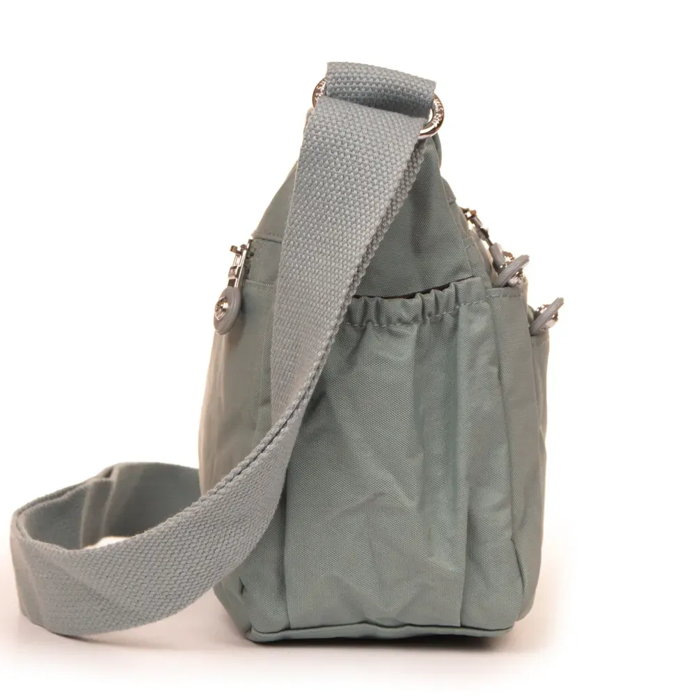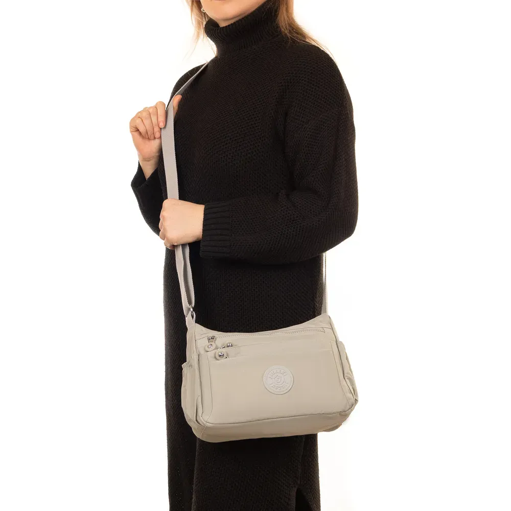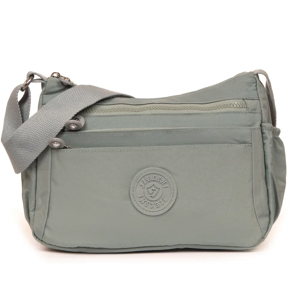 Женская сумка кросс боди. Изготовлена из водоотталкивающего текстиля. Двойное отделение, закрывается на молнию. Внутри есть карман-перегородка на молнии и боковой карман на молнии. На фасаде расположены три больших кармана на молнии, а на обратной стороне находится один вместительный карман на молнии. На торцах сумочки есть небольшие карманы на резинке.