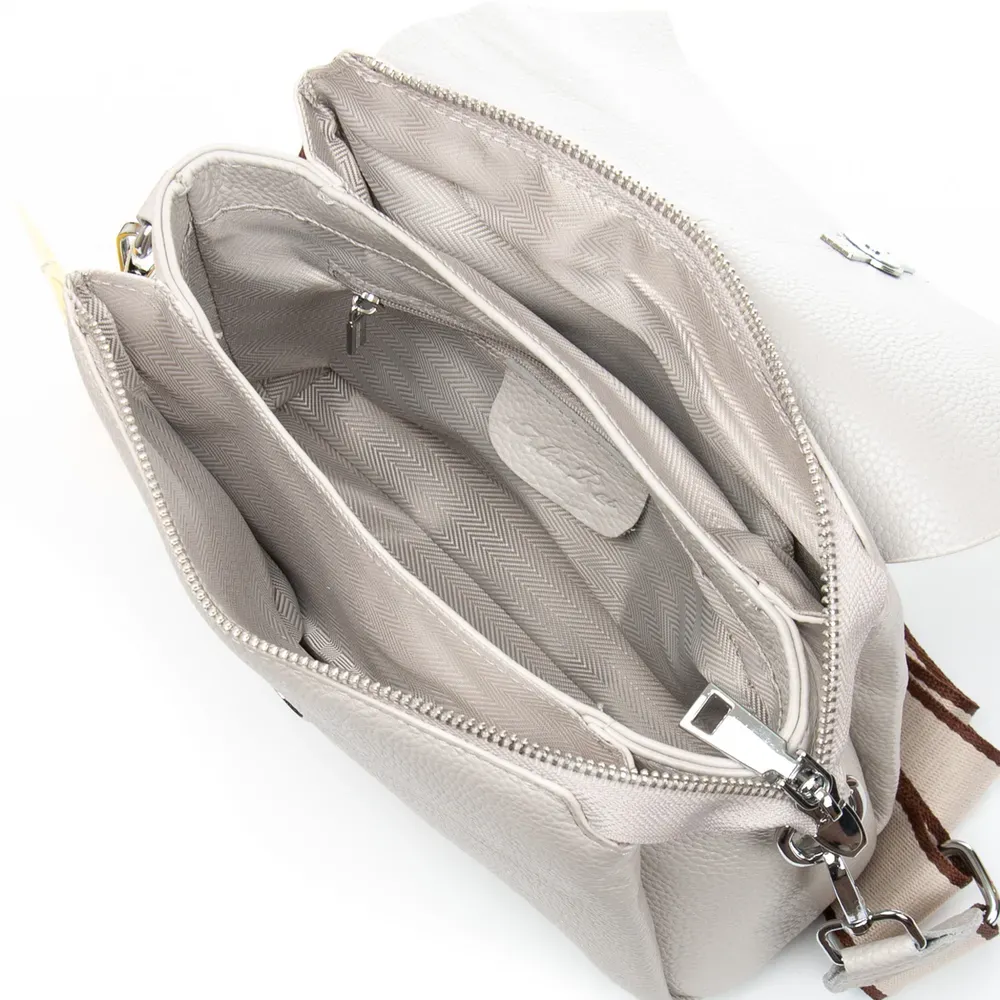 Жіноча сумка крос боді. Виготовлена з водовідштовхувального текстилю. Подвійне відділення, закривається на блискавку. Усередині є кишеня-перегородка на блискавці та бічна кишеня на блискавці. На фасаді розташовані три великі кишені на блискавці, а на звороті знаходиться одна містка кишеня на блискавці. На торцях сумочки є невеликі кишені на резинці. Плечовий ремінь шириною 4 см. і регулюється по довжині. /p>
