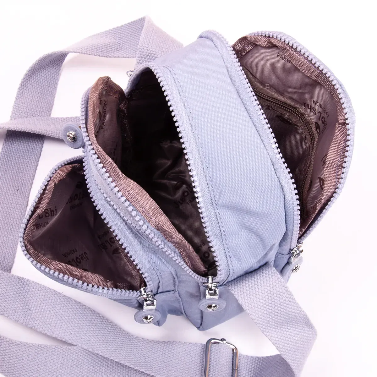 Жіноча сумочка крос боді. Виготовлена з водовідштовхувального текстилю. Два відділення, що закриваються на блискавці. Усередині є бічна кишеня на блискавці. На фасаді знаходяться дві кишені на блискавці.