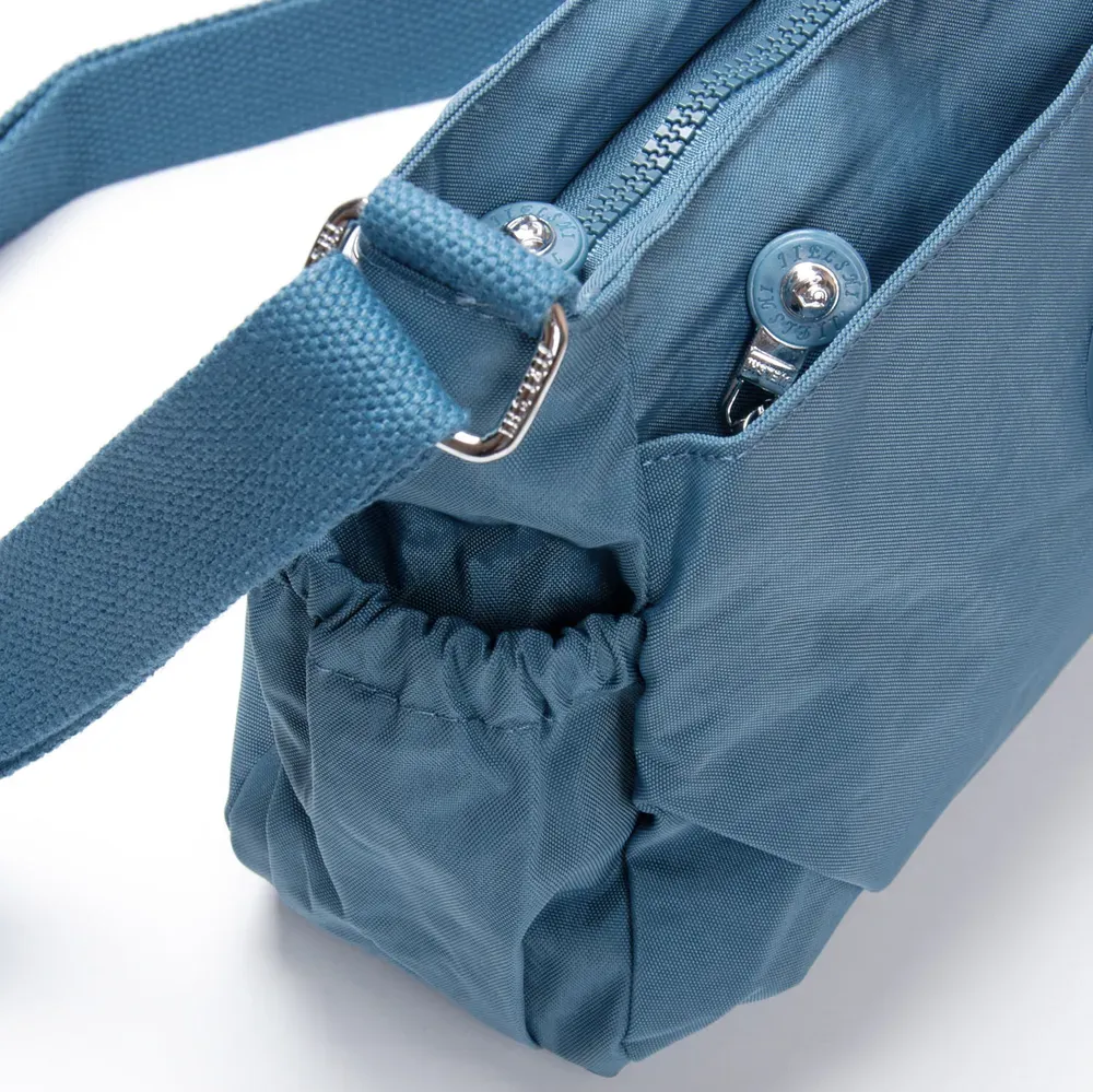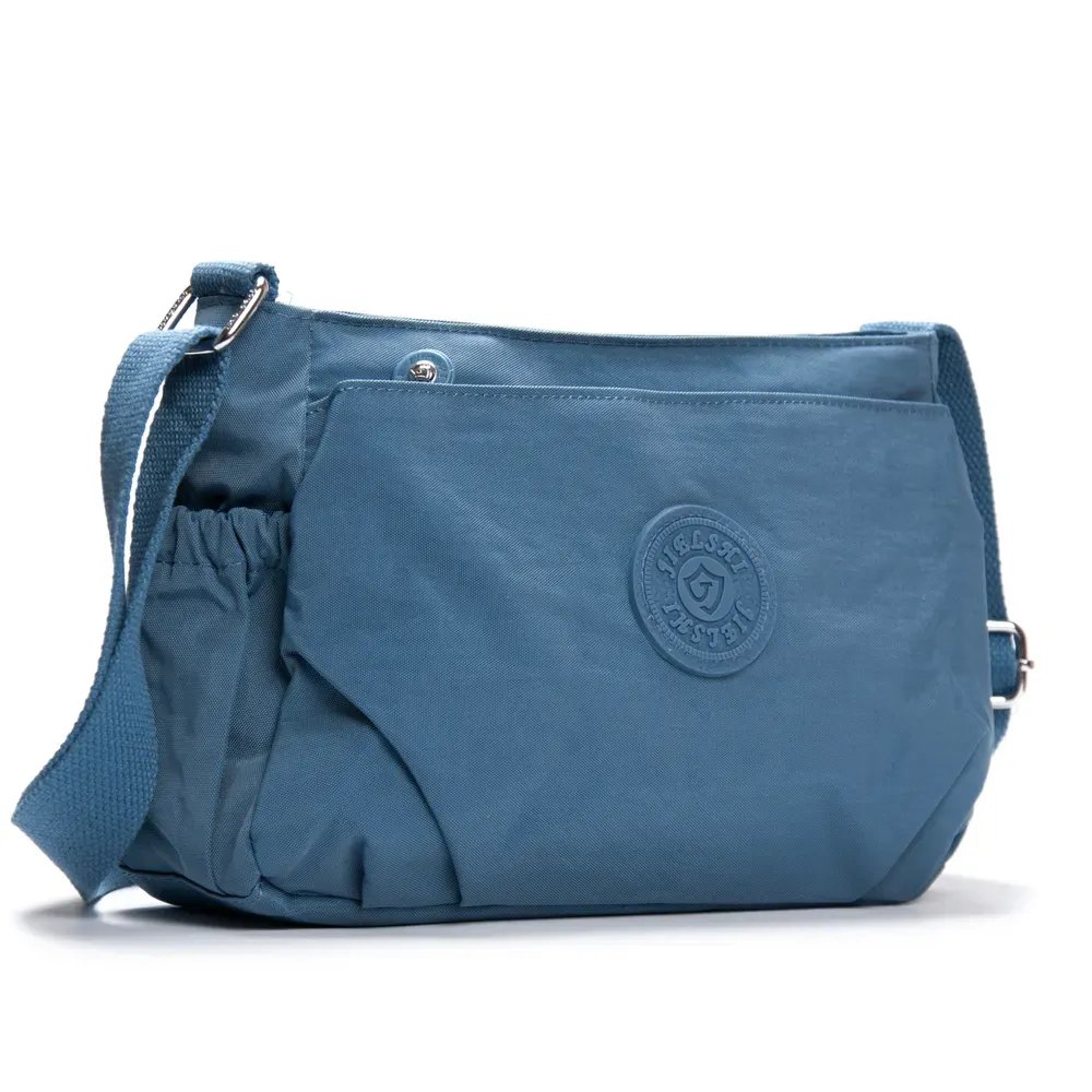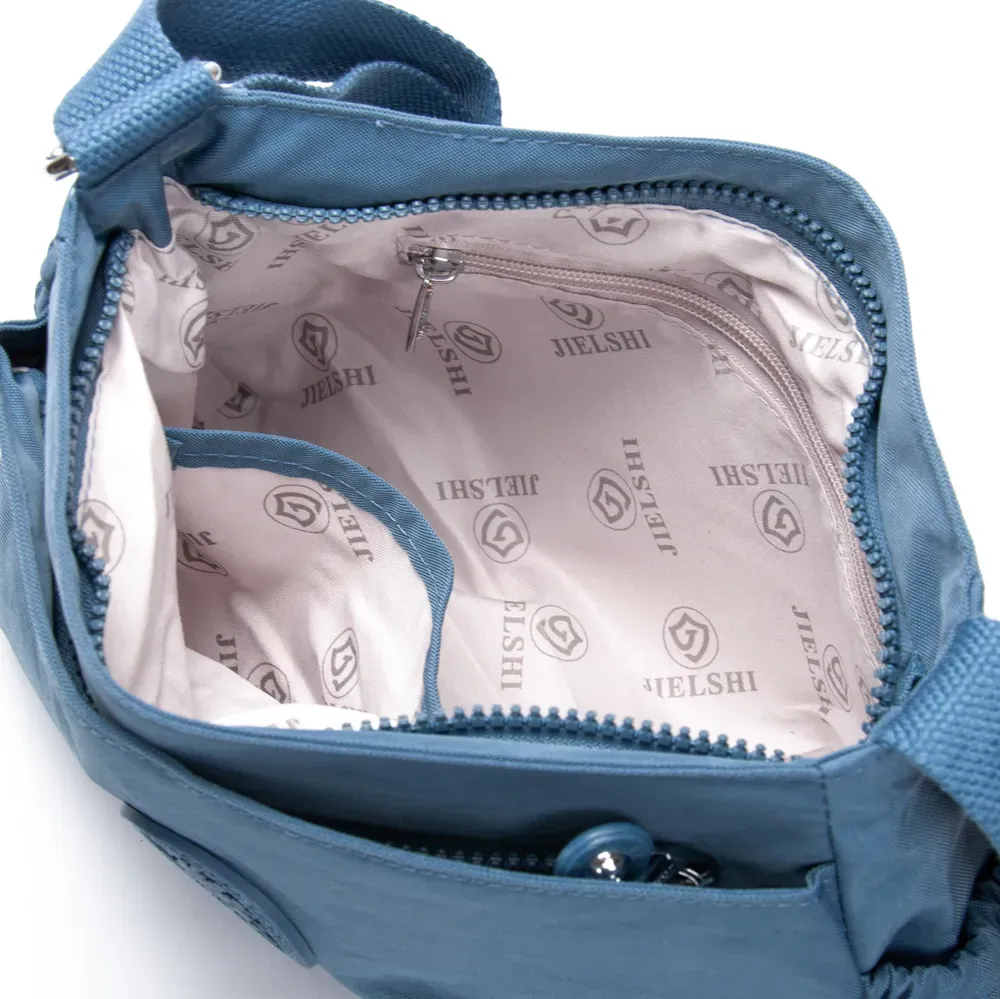 Женская сумка кросс-боди Jielshi. Изготовлена из водоотталкивающего текстиля. Одно отделение, закрывается на молнию. Внутри есть большой открытый боковой карман и карман на молнии. На фасаде и на обратной стороне находятся вместительные карманы на молнии. На торцах сумочки есть небольшие открытые карманы на резинке.
