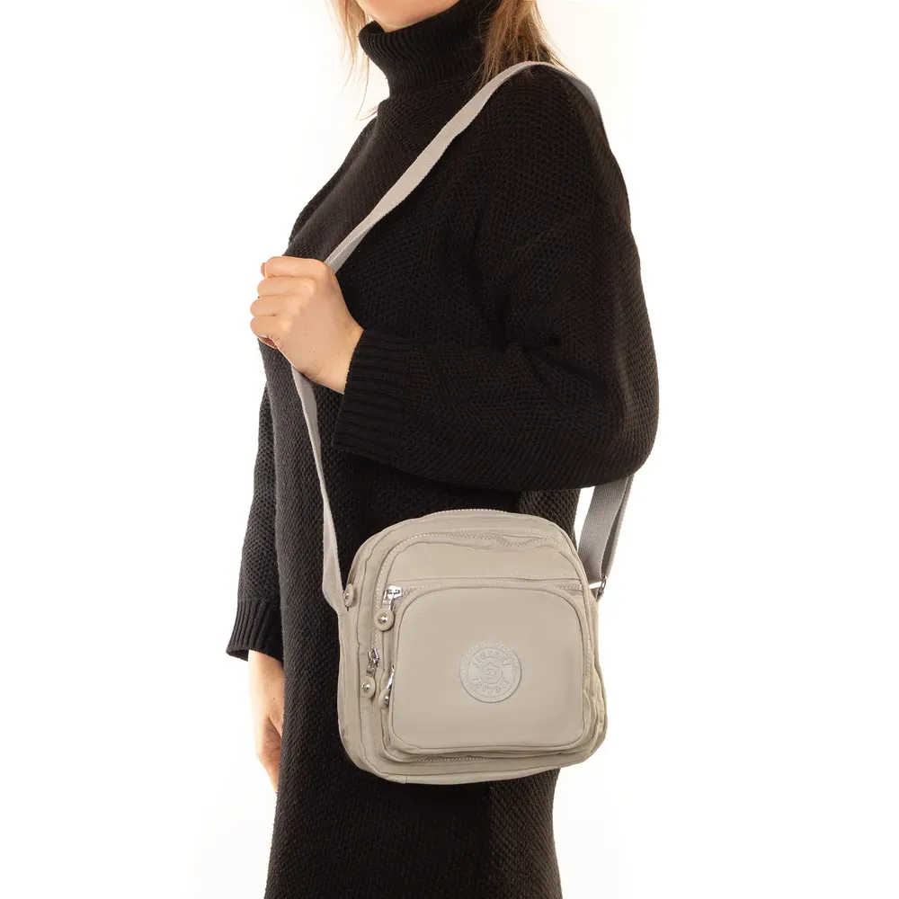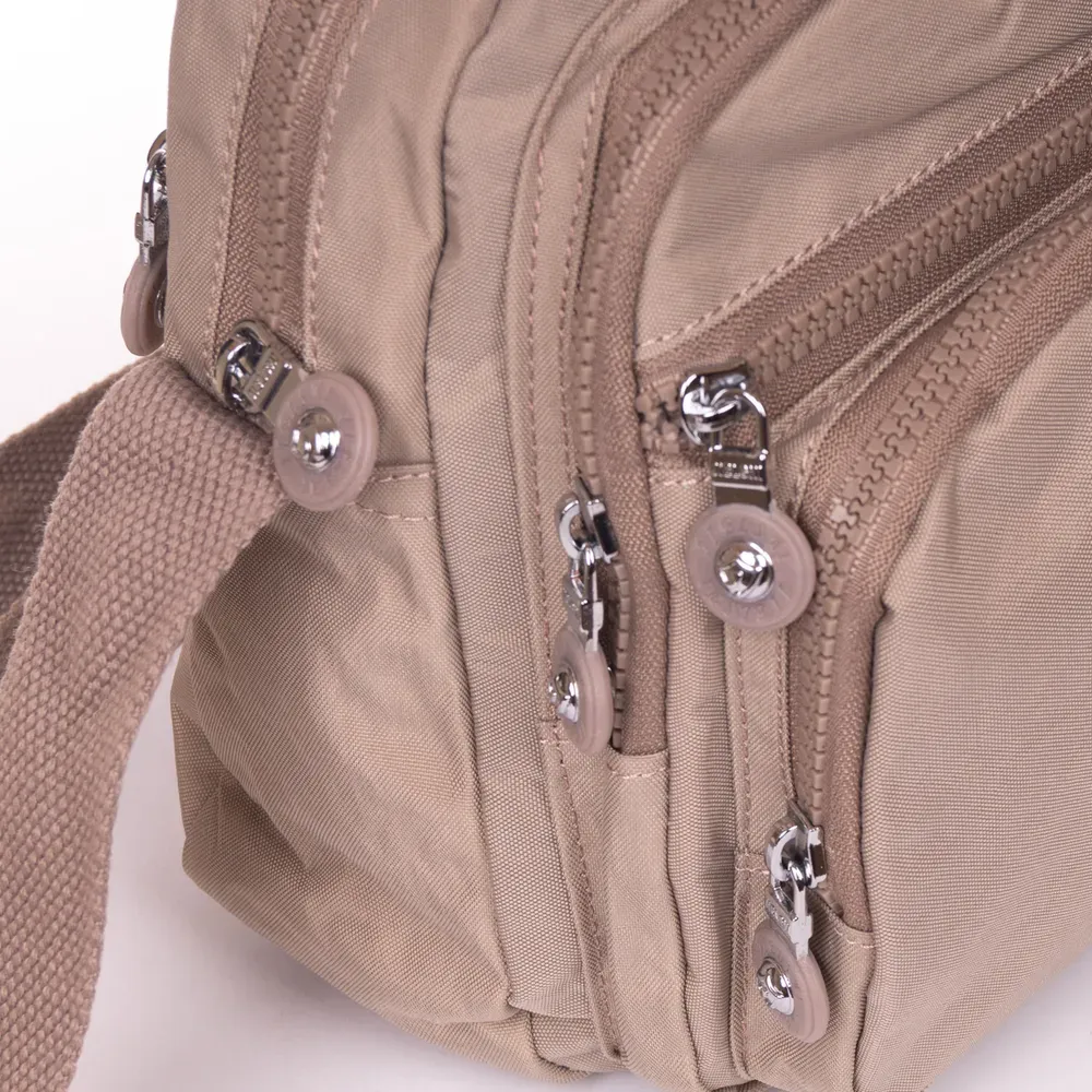 Женская сумочка кросс боди. Изготовлена из водотталкивающего текстиля. Два отделения, закрываются на молнию. Внутри есть боковой карман на молнии. На фасаде и на обратной стороне находятся вместительные карманы на молнии.