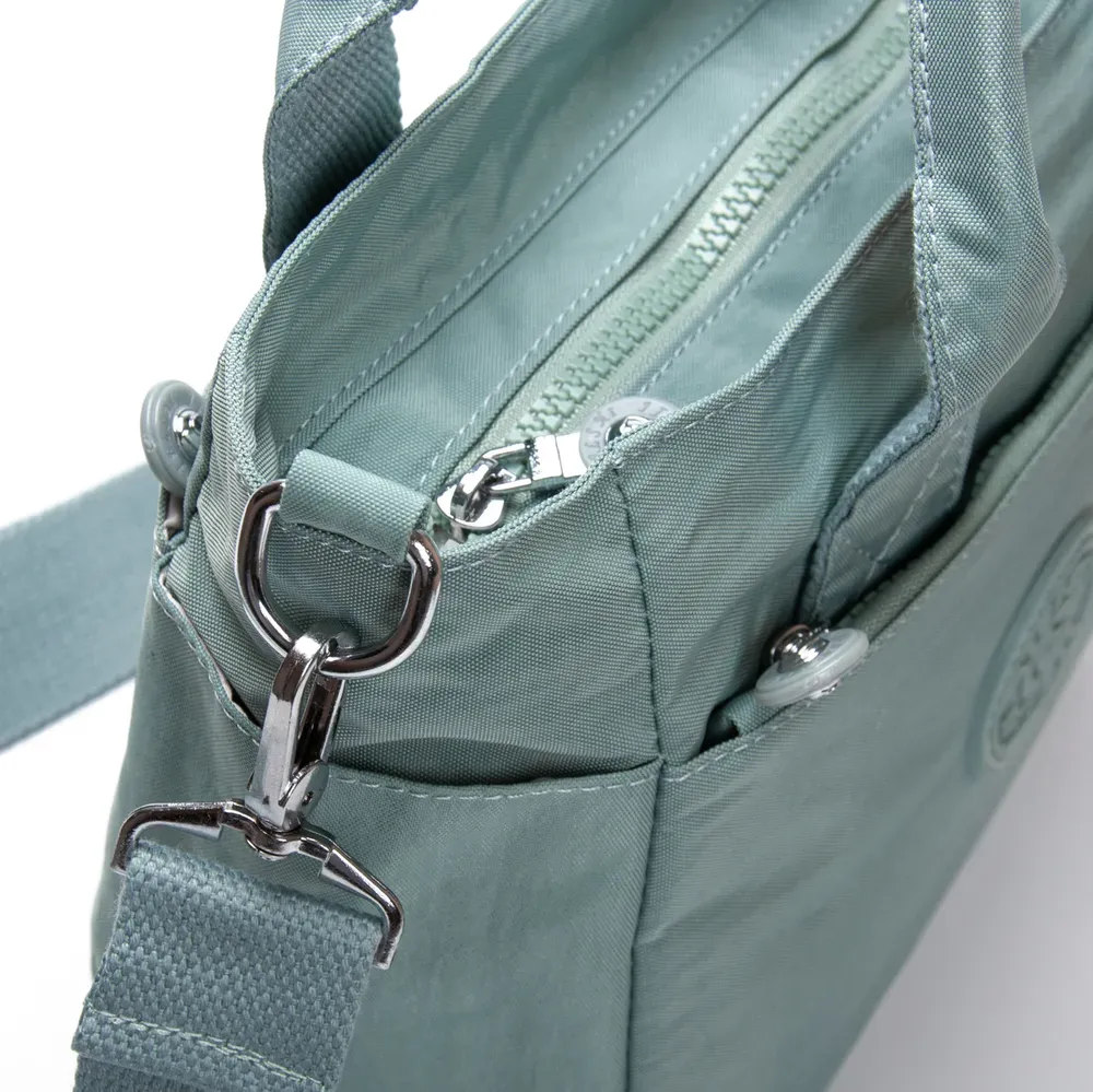 Женская сумка. Изготовлена из водотталкивающего текстиля. Одно отделение, закрывается на молнию. Внутри есть боковой карман на молнии и открытый большой карман с дополнительными отсеками для визитных карт. На фасаде и на обратной стороне находятся вместительные карманы на молнии, а на торцах есть небольшие открытые карманы.