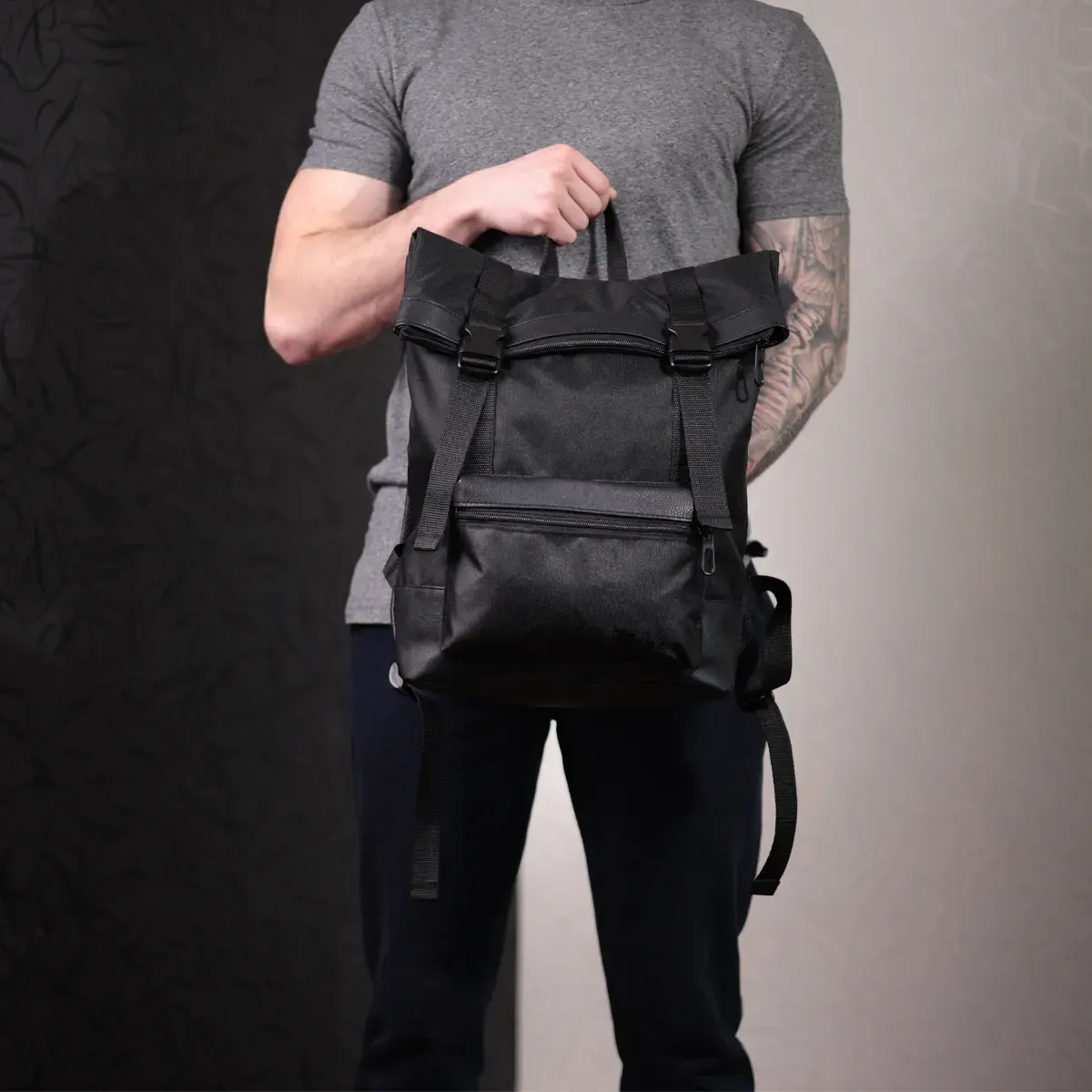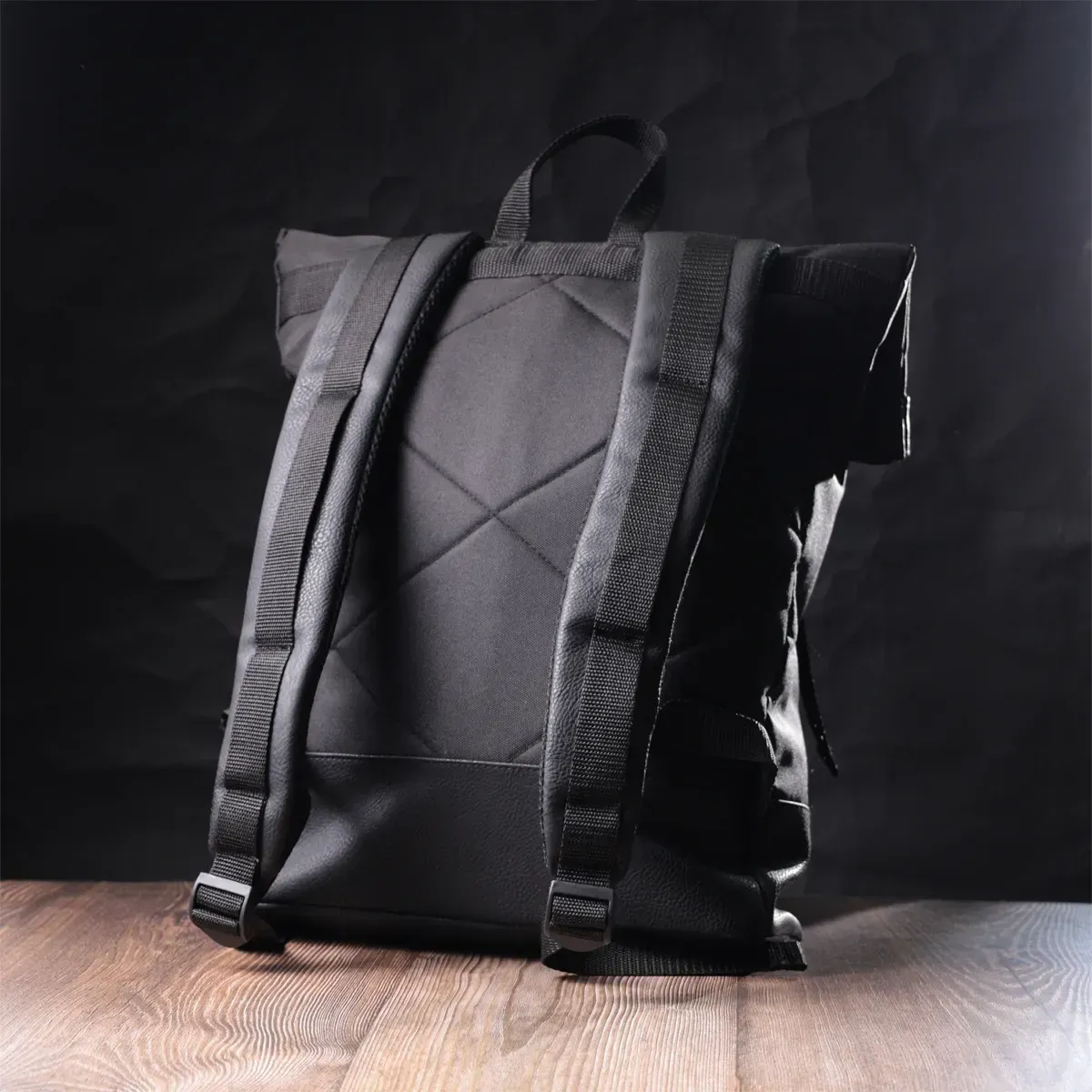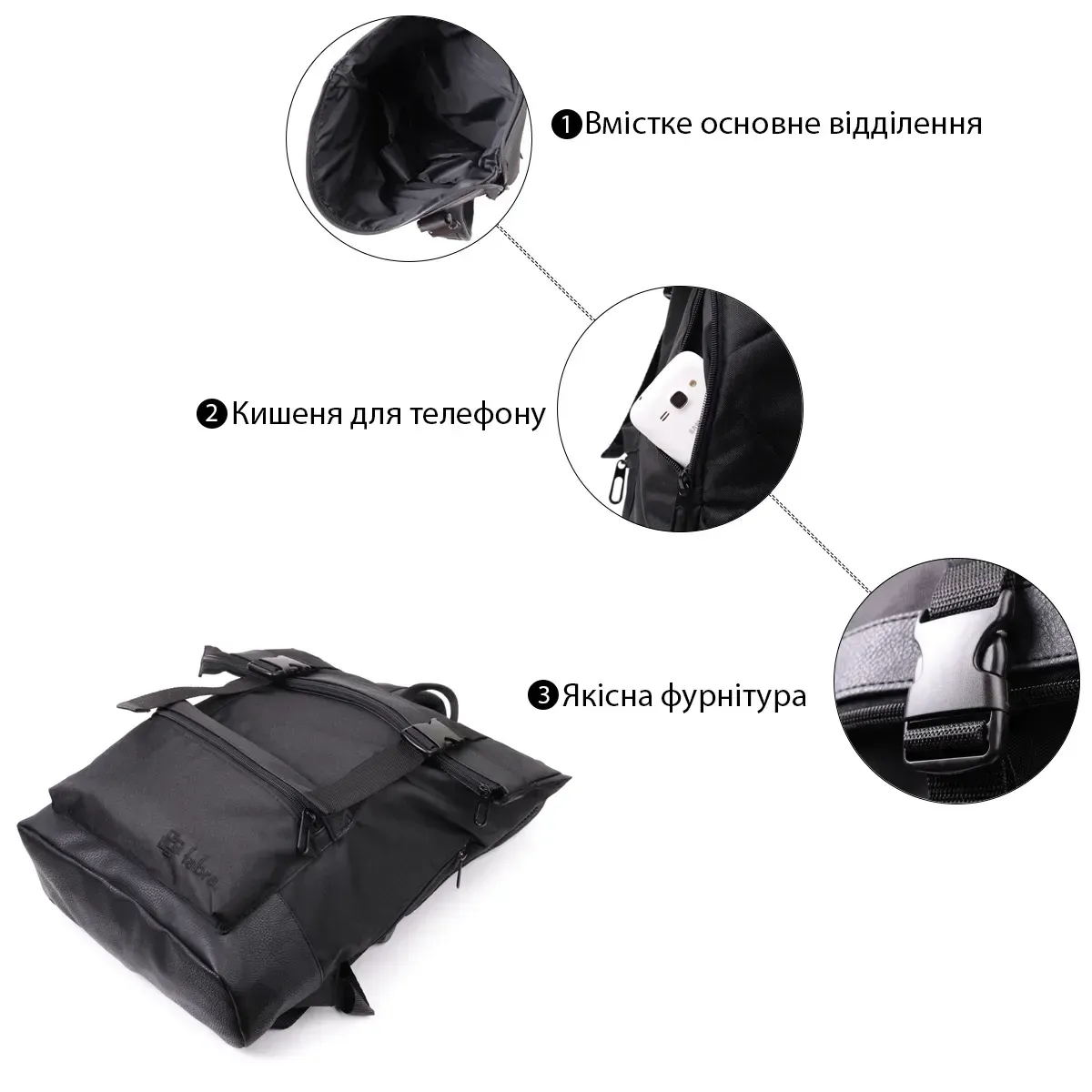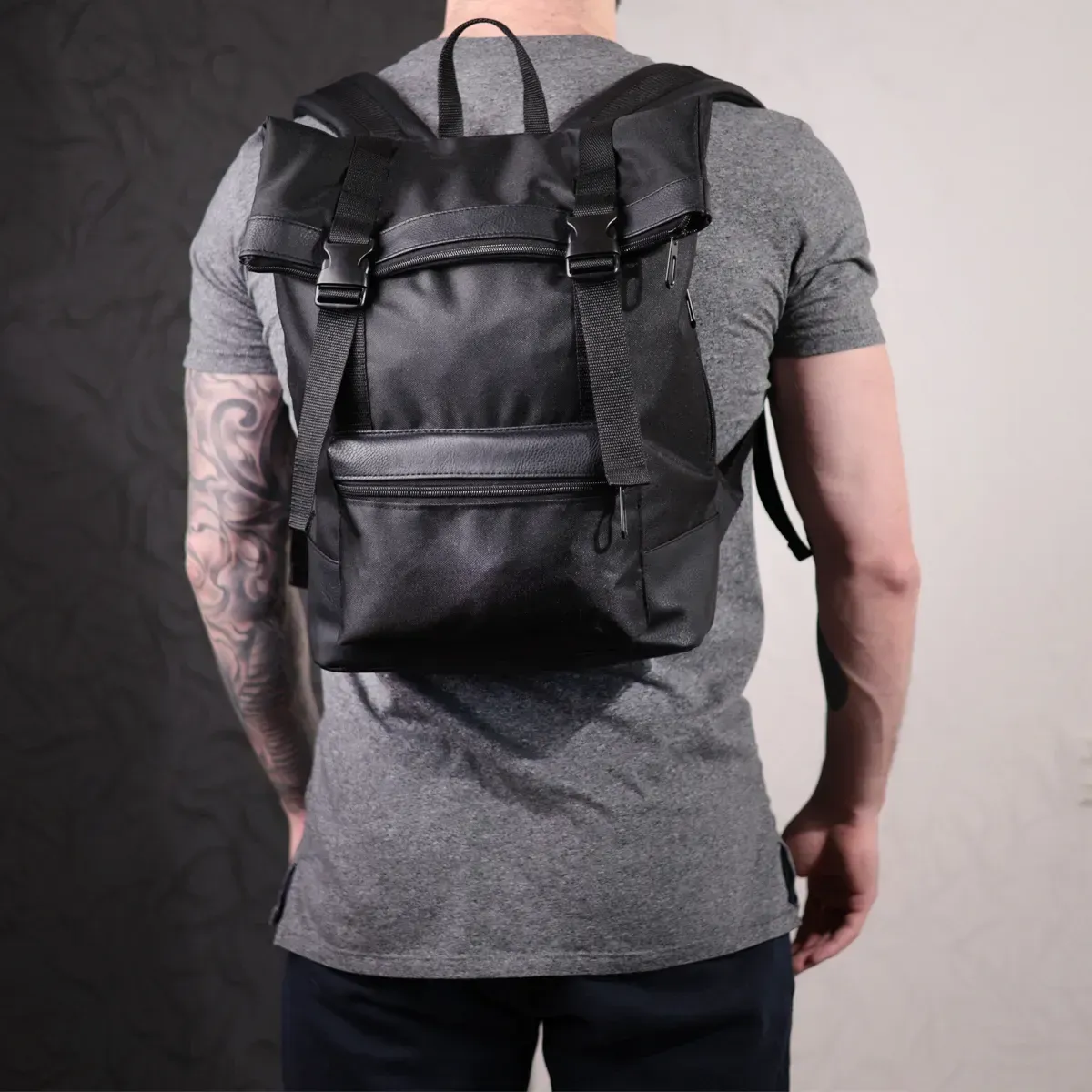 Трендовий рюкзак для ноутбука чорного кольору, з конструкцією Rolltop, що дозволяє збільшити місткість виробу. Висота виробу у складеному вигляді 40 сантиметрів, у розкладеному – 53 сантиметри. Аксесуар виготовлений з якісного матеріалу - поліестеру, знаменитого своєю міцністю та зносостійкістю. Також у рюкзаку присутні акценти з еко-шкіри, які надають виробу більш стильного вигляду. На лицьовій стороні, у правому нижньому кутку, розташований вишитий логотип бренду, що є запорукою якості. Усередині знаходяться два відділення: одне з них для ноутбука діагоналлю до 15,6 дюймів з ущільненою стінкою. Зовні: накладна горизонтальна кишеня на блискавці на лицьовій стороні та вертикальна бічна кишеня на блискавці. Носити рюкзак можна в руці, для цього призначена текстильна ручка, а також на спині, для цього є ущільнені лямки та ущільнена спинка для більшої зручності. Фурнітура яка використовується в аксесуарі, якісна, прослужить не один рік, рядки рівні, акуратні краї, підкладка міцна. Відмінний рюкзак як на кожен день, так і в подорожі, яка прослужить Вам не один рік і радуватиме око своїм первісним виглядом.