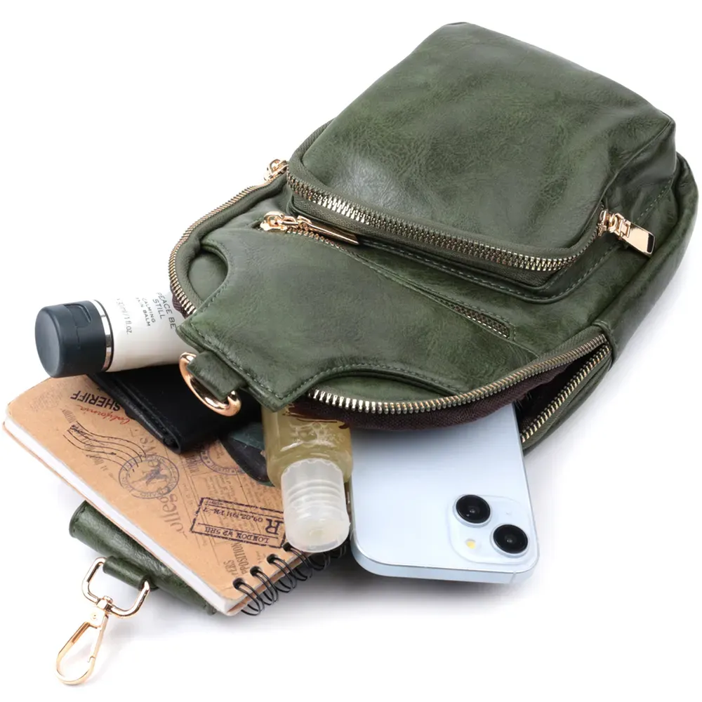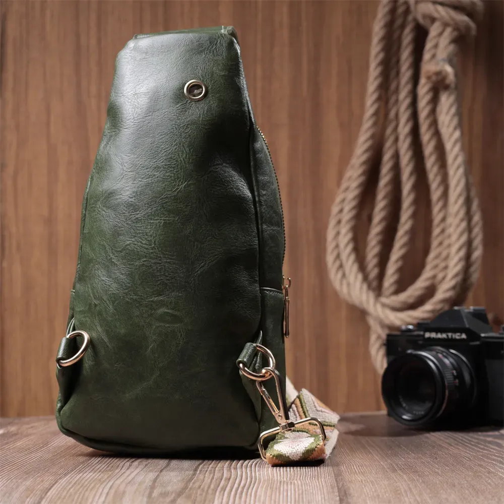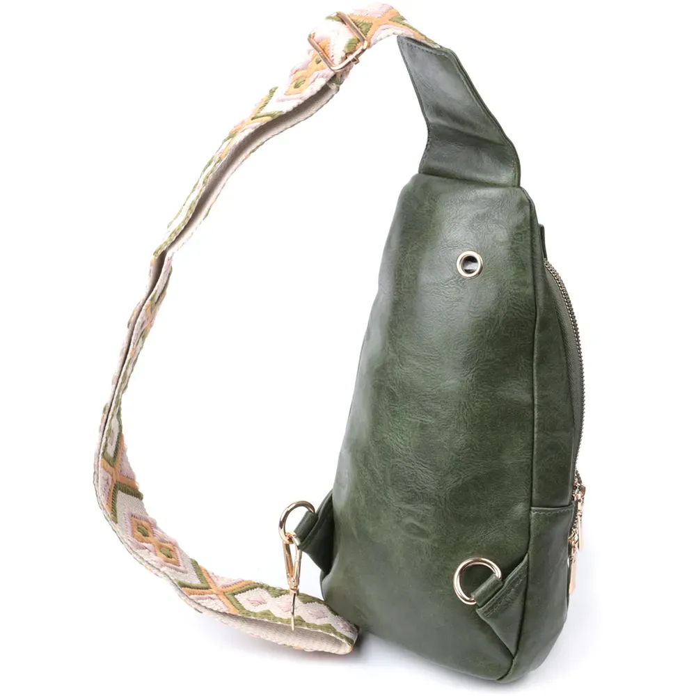 Екошкіра – високоякісна альтернатива натуральному матеріалу, яка дуже стійка до тертя, до низьких температур, відмінно носиться на відміну від інших штучних матеріалів, а також має гіпоалергенний склад на відміну від натуральної шкіри. Пропонуємо до Вашої уваги зручну слінг сумку з екошкіри в модному зеленому кольорі. Ця модель складається з одного основного відділення, яке закривається на блискавку і в якому знаходиться кишеня на блискавці і три кишені для кредитних карток, а також три кишені зовні та один отвор для кабелю або навушників, що дуже зручно в сучасному світі. Основною фішкою моделі є зручний регульований плечовий ремінець у етнічному стилі, що дуже модно вже кілька сезонів.