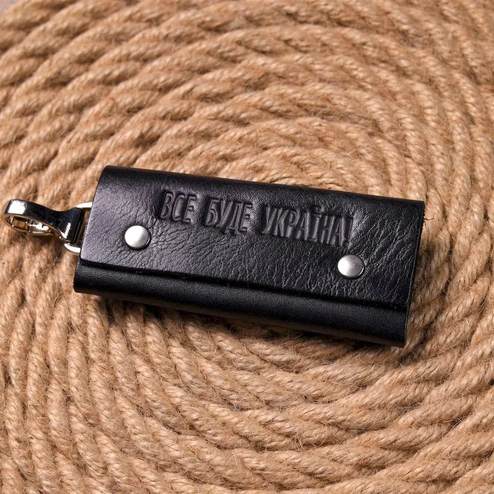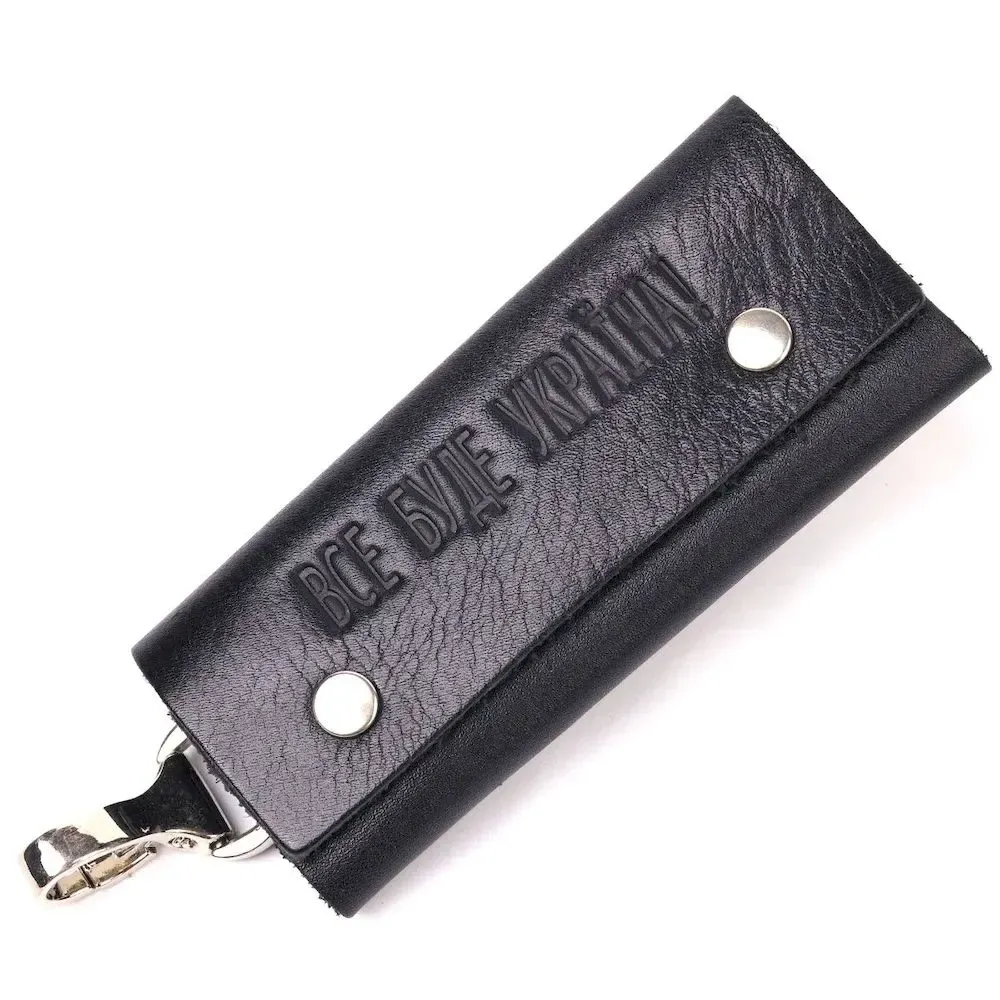 Надійна шкіряна ключниця на кнопках, з патріотичним тисненням на лицьовій стороні “Все буде Україна”. Виріб пошитий з гладкої шкіри, з високими показниками зносостійкості. В аксесуарі використано надійну фурнітуру, кольори срібла. Вироби зі шкіри завжди вважалися відмінним подарунком, незалежно від статі та віку.