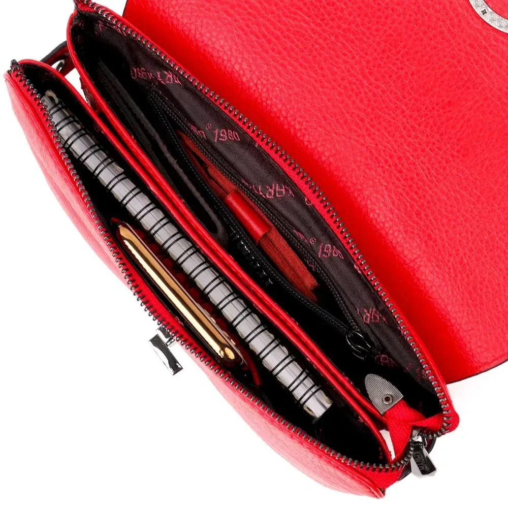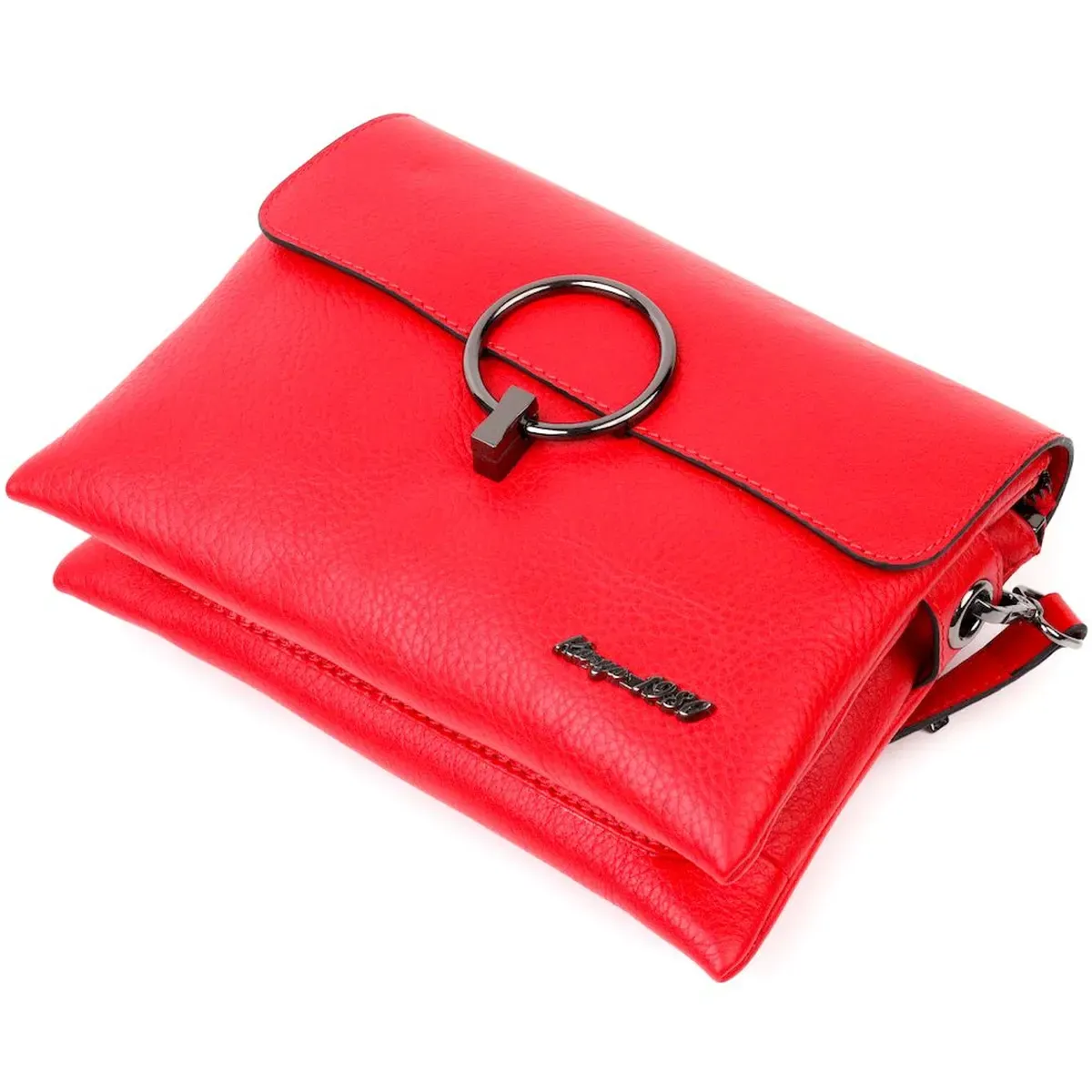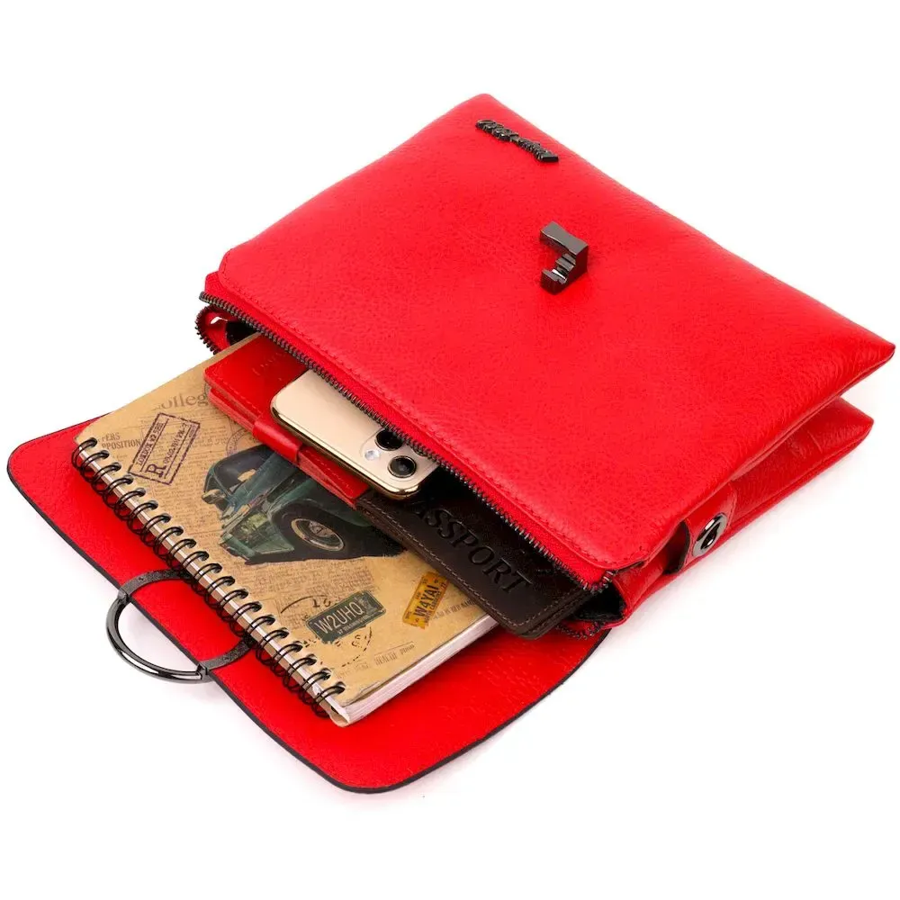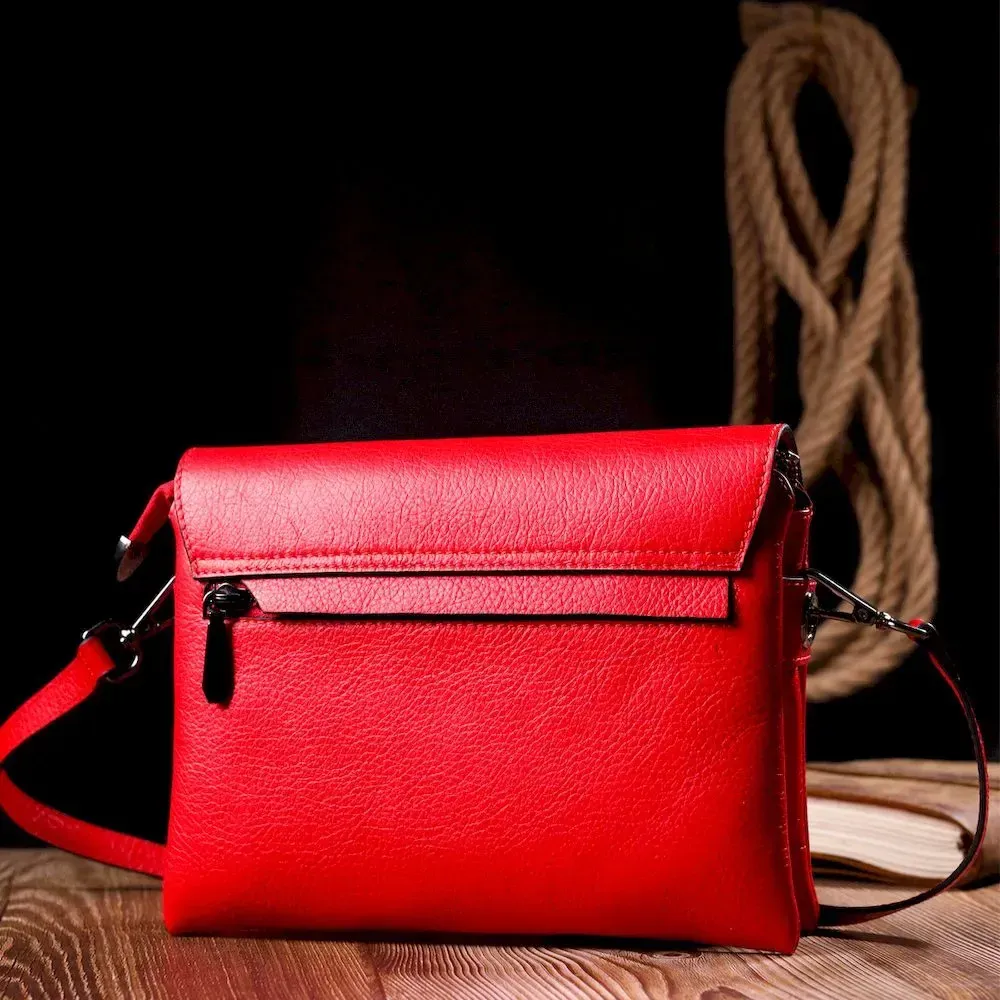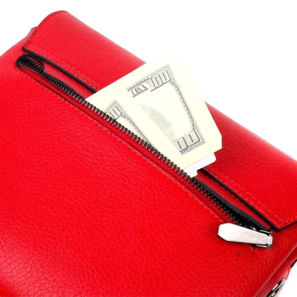 Невелика містка жіноча сумка-клатч із натуральної зернистої шкіри, червоного кольору. Сумка функціональна та зручна в експлуатації, якісна фурнітура сріблястого кольору відмінно доповнює стильний та неабиякий дизайн сумки.