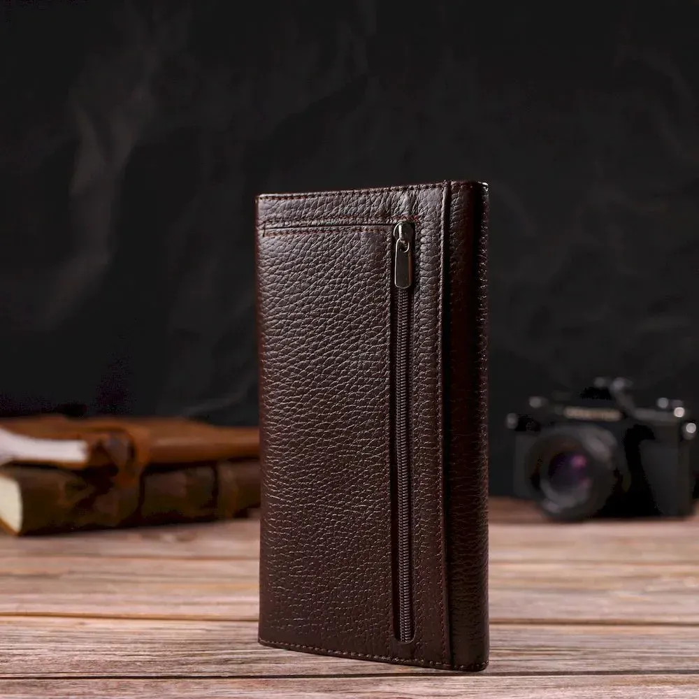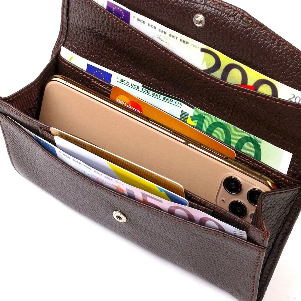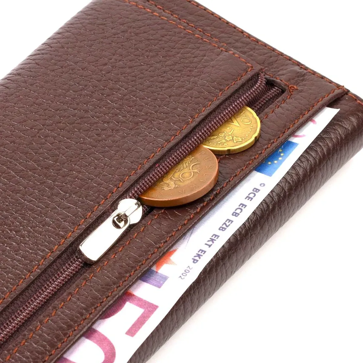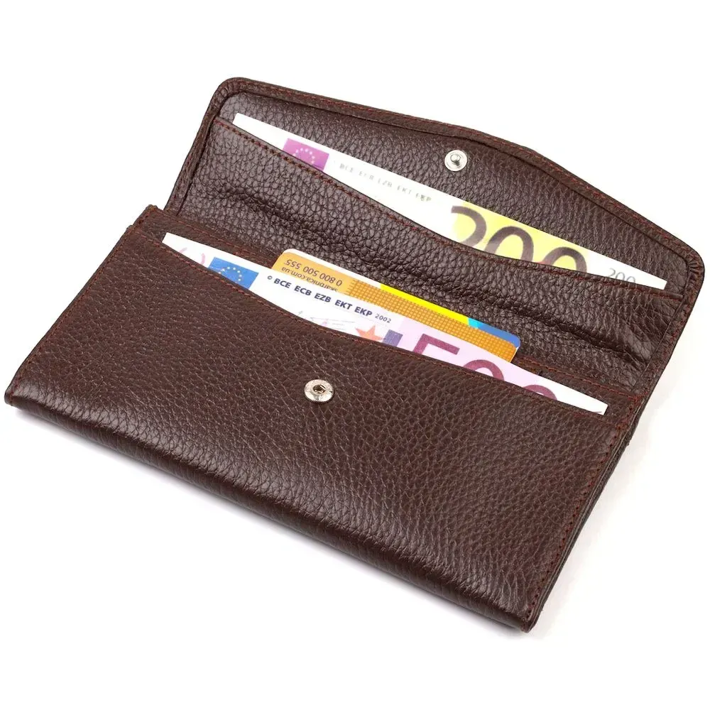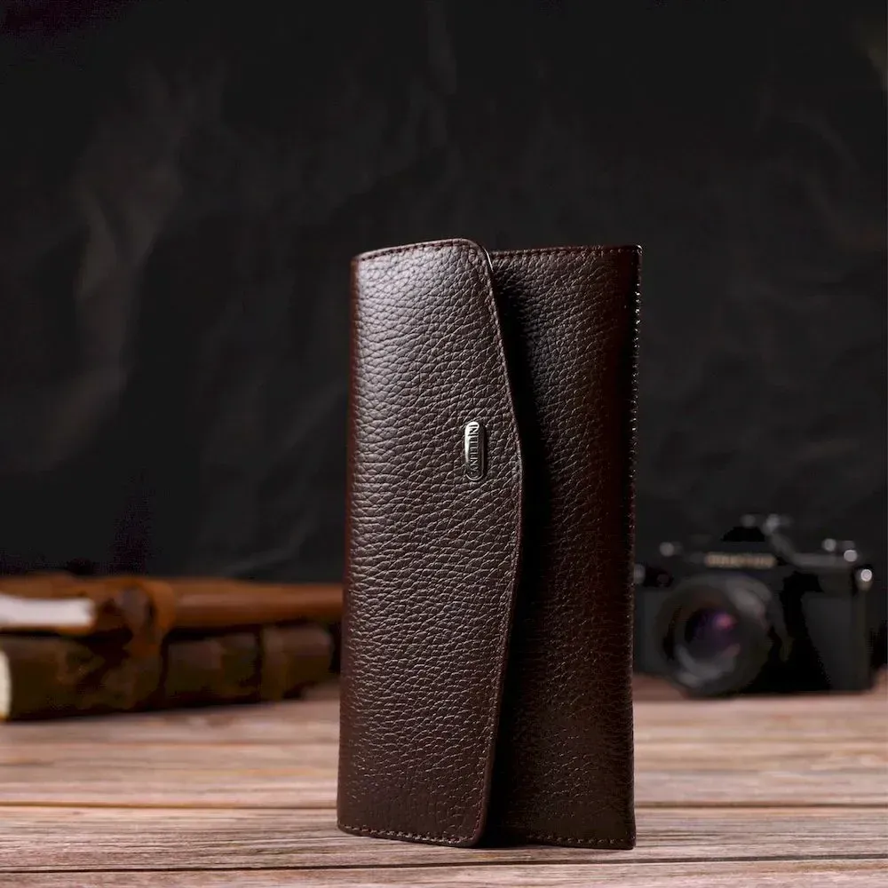 Місткий жіночий гаманець горизонтального типу з якісної натуральної шкіри. Аксесуар має одне основне відділення, шість кишень для карток, чотири прилеглі кишені та монетницю. Закривається аксесуар наполовину клапаном на кнопку. Купуючи шкіряний аксесуар цієї фірми, собі або на подарунок, будьте певні, що він прослужить Вам не один рік.
